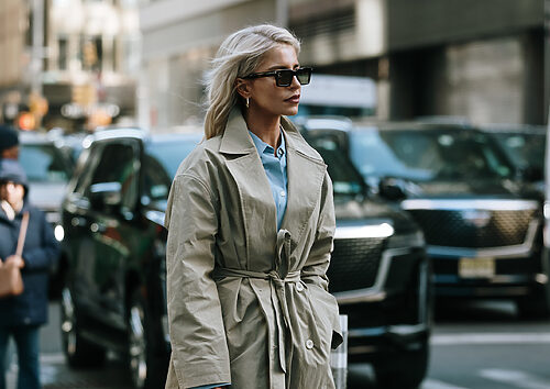 풍성한 양털 트렌치코트, 과감한 골드 버클 벨트, 버클 장식 부츠는 모두 Burberry Prorsum제품.