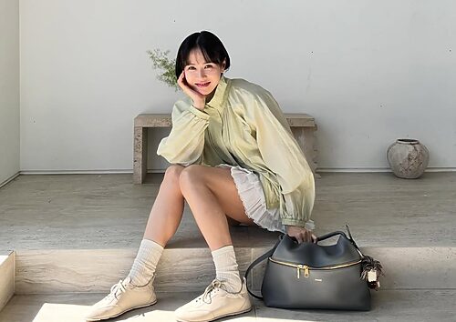 1. 캐주얼한 면 소재 재킷은 Andew, 모던한 데님 셔츠는 Andew, 톰보이스러운 체크 쇼츠는 Bean Pole Ladies, 뱀피 소재의 웨지힐은 96ny 제품.