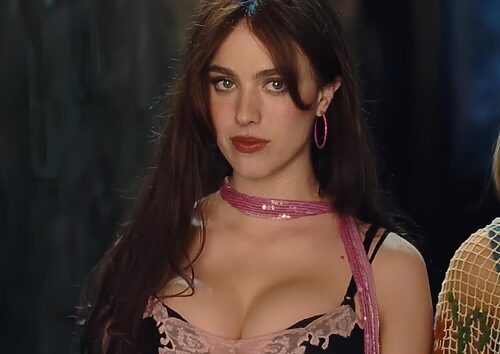 식물 패턴이 담긴 크롭트 톱과 스커트 쇼츠, 가죽 소재 헤어밴드, 간결한 라인의 네크리스와 뱅글은 모두 Balenciaga 제품.