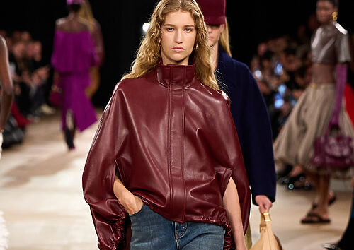 꽃무늬 밀리터리 재킷은 Off White by Tomgreyhound, 가죽 소재의 에이프런은 Vetements by Boon the Shop, 와인색 가죽 팬츠는 Bottega Veneta, 검정 페이턴트 슈즈는 Comme Des Garçons Homme Plus 제품.