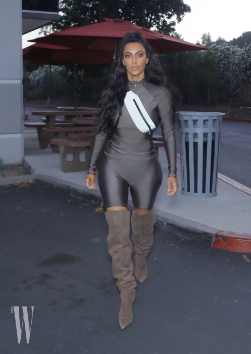 2018 7월. 사이클링 쇼츠가 트렌드 아이템으로 떠올라 초강수를 둔 걸까. 톱까지 스판덱스로 통일하고 거기에 사이하이 부츠까지 신었다. ‘멋’을 위해서라면 킴의 사전에 더위란 중요하지 않은 듯.