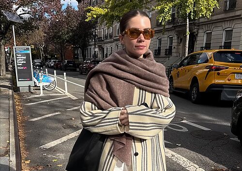 컬러 배색 칼라가 특징적인 재킷은 Louis Vuitton, 안에 입은 블라우스는 Burberry, 팬츠는 Golden Goose Deluxe Brand, 스트랩 샌들은 Stuart Weitzman 제품.