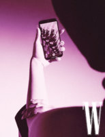 시스루 톱은 Givenchy, 스터드 이어링은 Balenciaga, 펑키한 티셔츠가 장식된 데님 팬츠는 Dyed 제품.