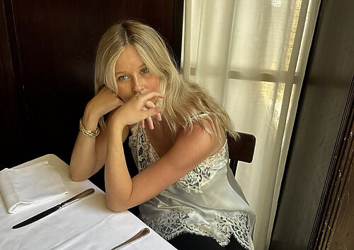 화이트 셔츠, 재킷과 튤 소재 스커트, 장미 펜던트 목걸이는 모두 디올 제품.