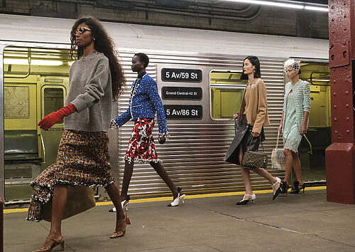 입체적인 소재의 롱 코트는 비건 타이거, 스와로브스키 장식의 롱 드레스는 셀프 포트레이트 제품.