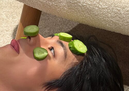 왼 손목에 착용한 핑크 골드, 브릴리언트 컷 다이아몬드 세팅 스몰 모델 저스트 앵 끌루 브레이슬릿과 쿼츠 무브먼트. 옐로 골드 케이스 및 브레이슬릿의 베누아 워치, 엄지와 중지, 새끼에 낀 화이트 골드, 핑크 골드, 옐로 골드 세팅 트리니티 링은 모두 Cartier 제품. 검정 슬리브리스 미니드레스는 Ami 제품.