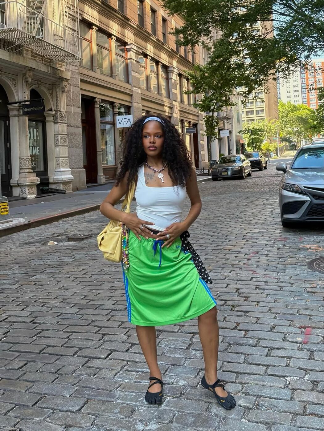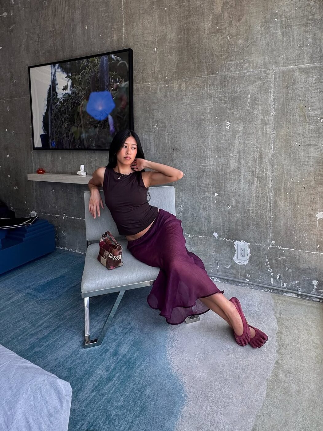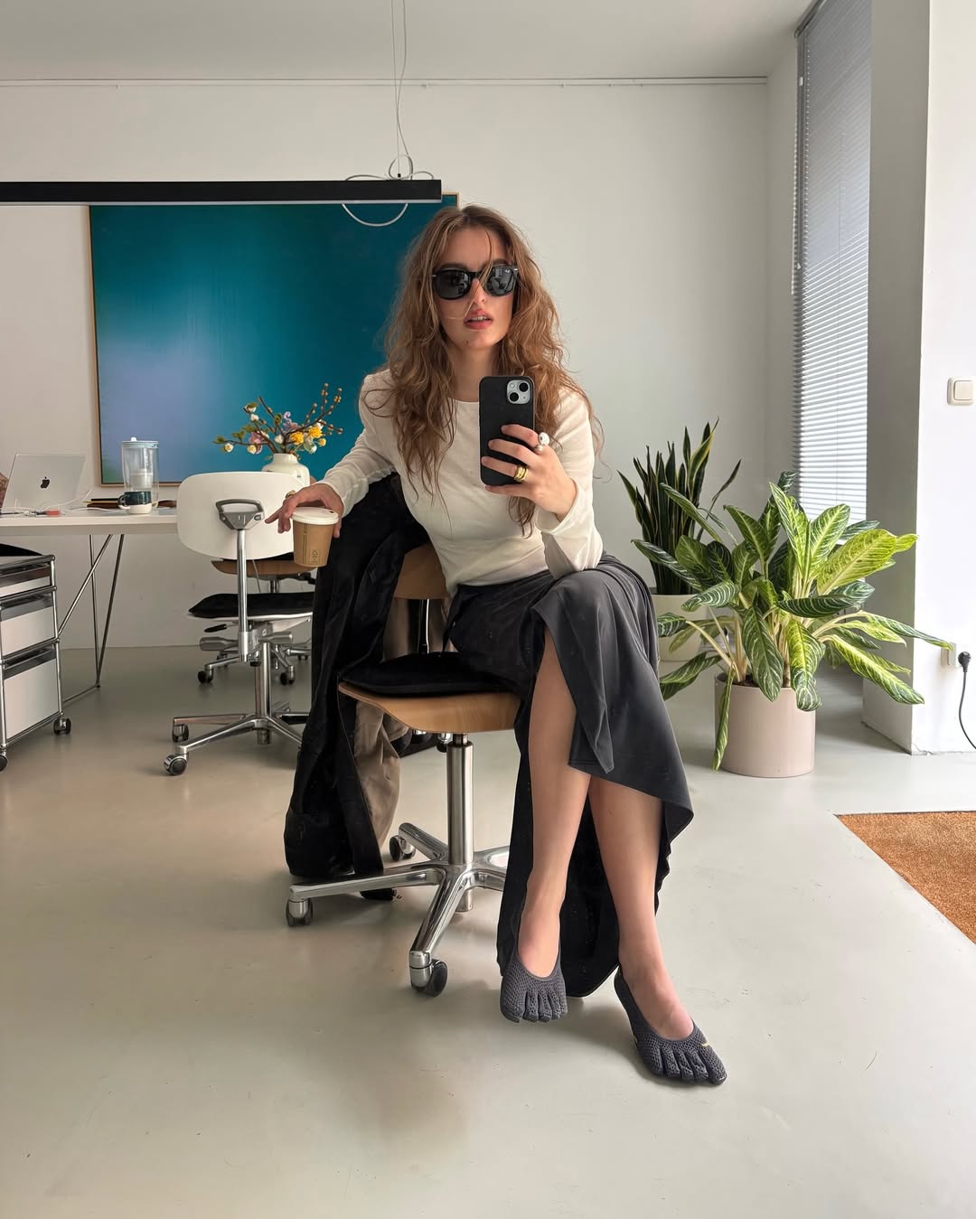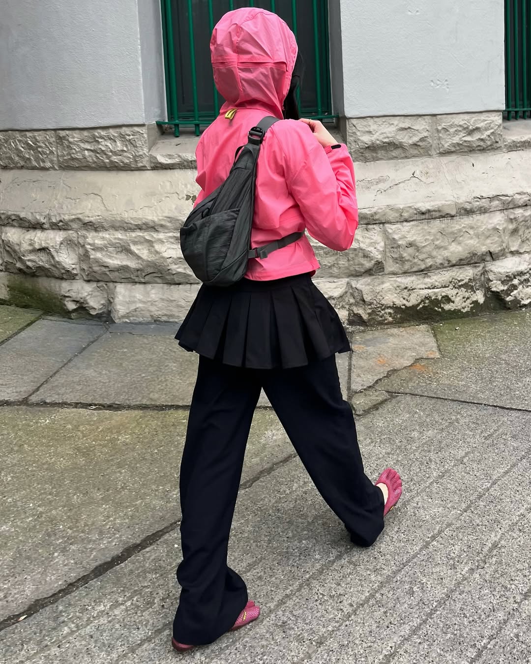 스포티 룩도 이렇게 다를 수 있습니다. 네온 컬러 저지 스커트, 펑키한 헤어, 그리고 파이브핑거스. 이 조합은 그냥 운동화로는 흉내 낼 수 없는 독특한 분위기를 만들어줍니다. 플랫슈즈보다 활동적이고, 스니커즈보다 실루엣이 가볍고 날렵해 보이는 효과가 있죠.