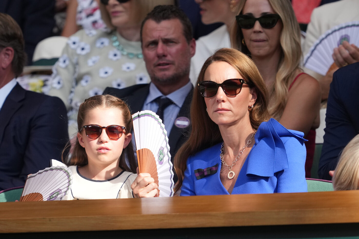 뜨거운 햇살이 내리쬔 경기장에서 선글라스를 나란히 착용한 로열 모녀. 손에는 윔블던 테니스 로고가 들어간 부채를 들고 레이 밴 키즈 라인으로 쓴 샬럿과 살짝 캣아이 느낌이 나는 선글라스를 쓰고 경기에 집중한 케이트의 모습이 사뭇 진지해 보입니다.