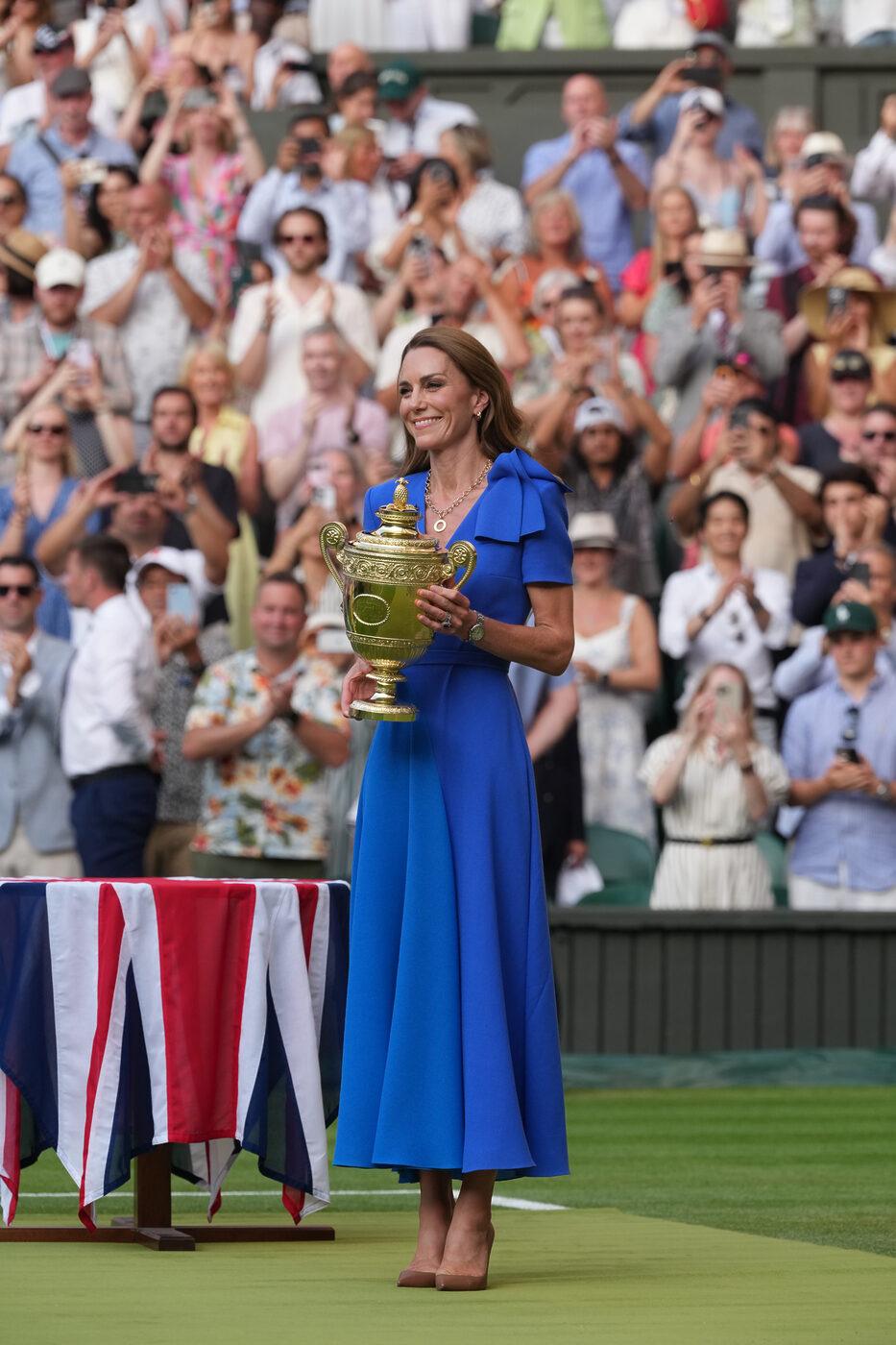 화이트 룩이 대세인 경기장을 배경으로 우아한 라인의 새파란 드레스를 입고 시상식에 등장한 케이트. 다이애나비의 뒤를 이어 윔블던 대회 우승자들에게 우승컵을 증정하는 역할을 맡고 있는 왕세자비의 자태가 독보적입니다.