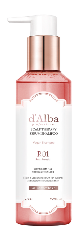 4. D’alba 로제 프리지아 비건 리페어링 스칼프 테라피 세럼 샴푸 부드럽고 풍성한 거품이 탈모 증상을 효과적으로 완화하고 두피 각질을 깨끗하게 정돈하는 스칼프 샴푸. 275ml, 3만8천원.