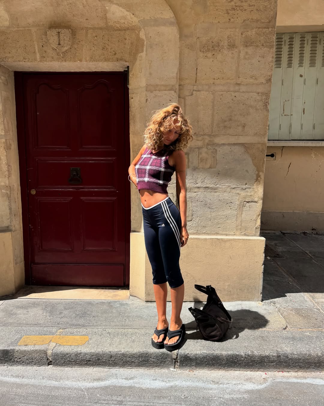 흔한 조합인데 분위기는 완전히 달라요. 타이트한 저지 탑에 아주 짧은 마이크로 쇼츠를 매치한 미니멀 룩. 스포티하지 않아서 더 쿨하고 그래서 더 눈에 띄어요.