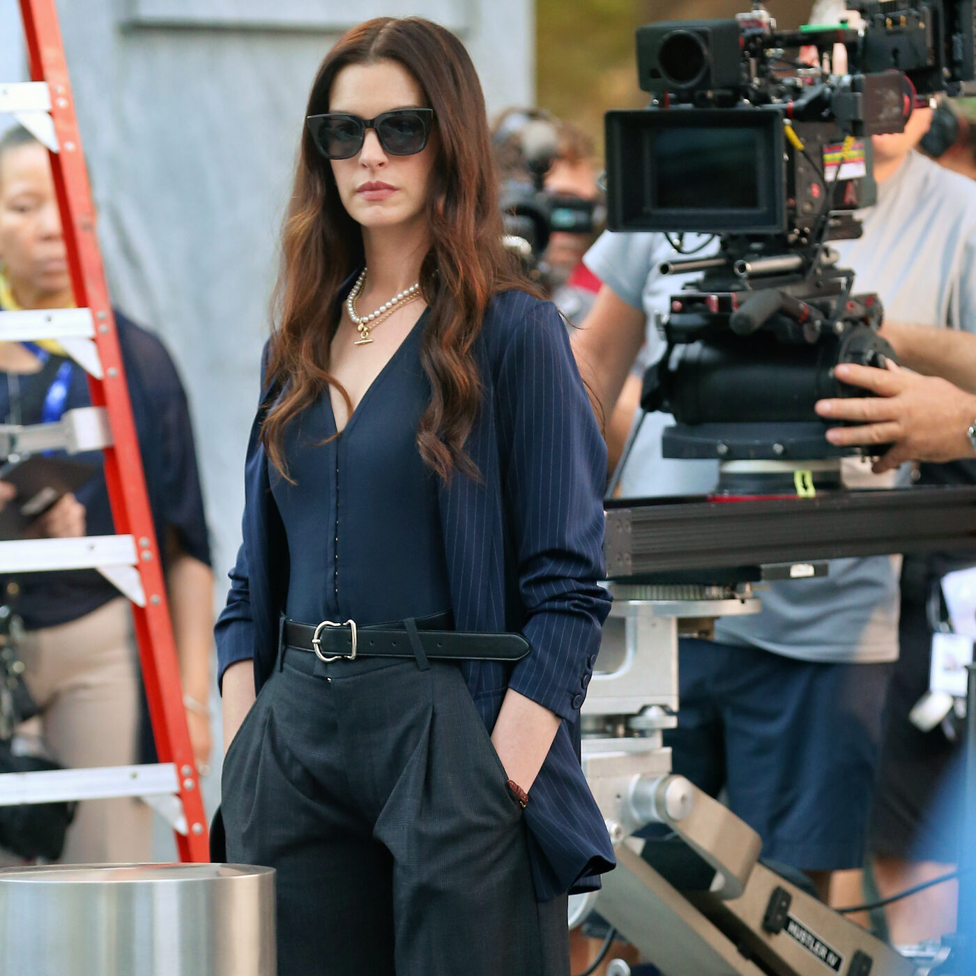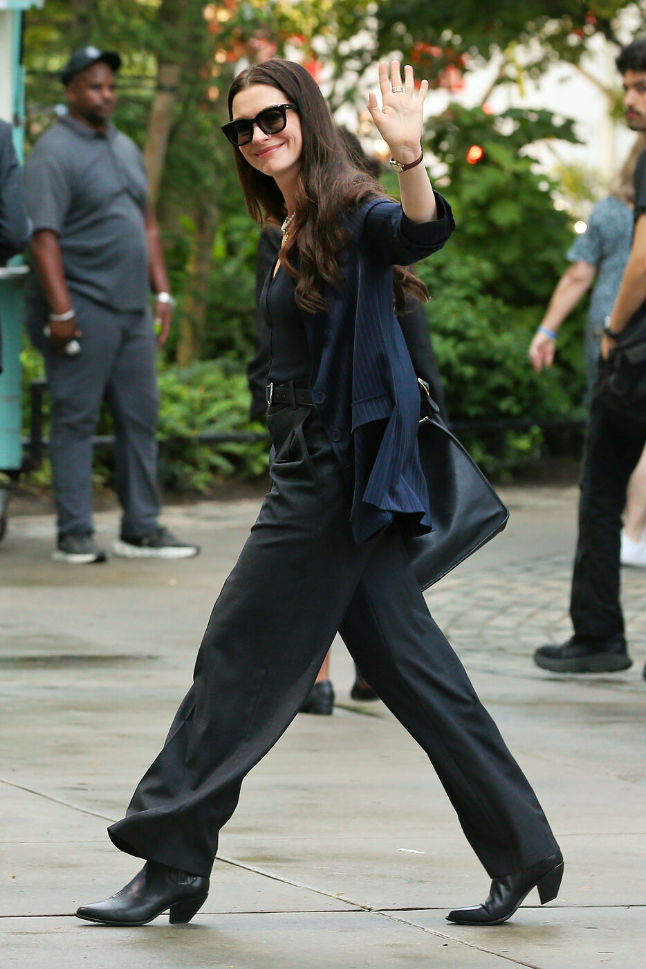 핀 스트라이프 패턴의 조끼 슈트를 입고 뉴욕 길거리에 등장한 앤 해서웨이. 재킷이 아닌 베스트를 탑으로 활용해 시원한 여름용 출근룩을 보여줬죠. 얄상한 조끼 실루엣과는 대조되는 곡선형 실루엣의 팬츠로 멋스러움을 잃지 않은 것 또한 눈에 띄네요.