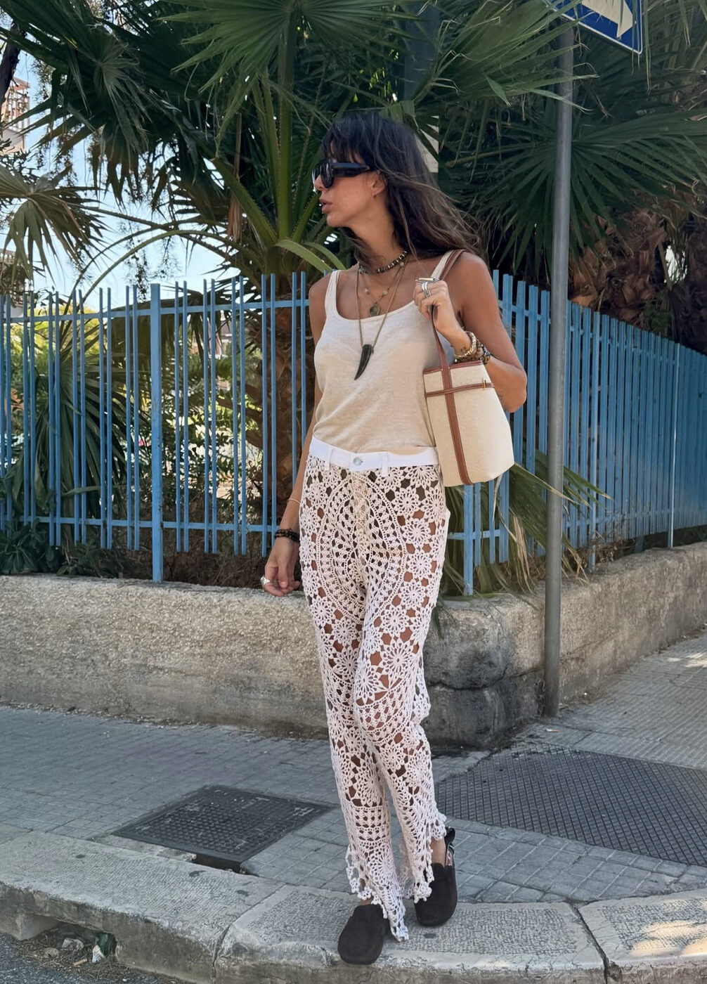 좀 더 과감하게 크로셰 룩에 도전한다면? 구멍이 숭숭난 팬츠로 섹시하고도 아티스틱한 팬츠리스 룩을 선보였습니다. 심플한 탱크톱에 반복적인 패턴이 돋보이는 크로셰 팬츠를 입고 보호 감성 충만한 액세서리들로 포인트를 주었죠. (@estellepigault)