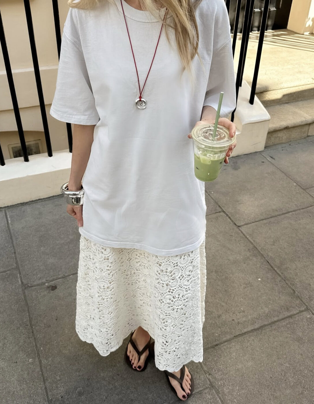 가장 간편하게 시도할 수 있는 스타일링이 바로 이겁니다. 기본 흰색 티셔츠에 마치 꽃받침이 한 가득 모여 있는 듯, 화려한 패턴을 자랑하는 화이크 크로셰 스커트를 매치하는 거죠. 다른 스타일링은 필요 없어요. 크로셰의 텍스쳐가 다채로움을 선사합니다. 여기엔 독특한 펜던트 네트리스 하나면 충분해요. (@chloekathbutler)
