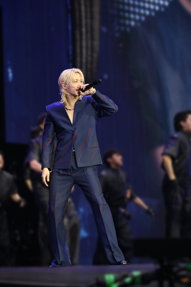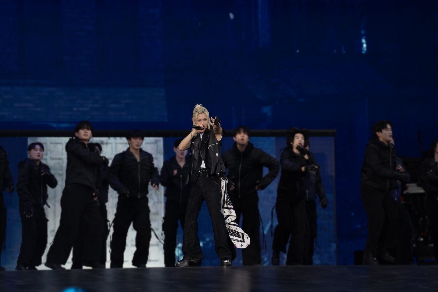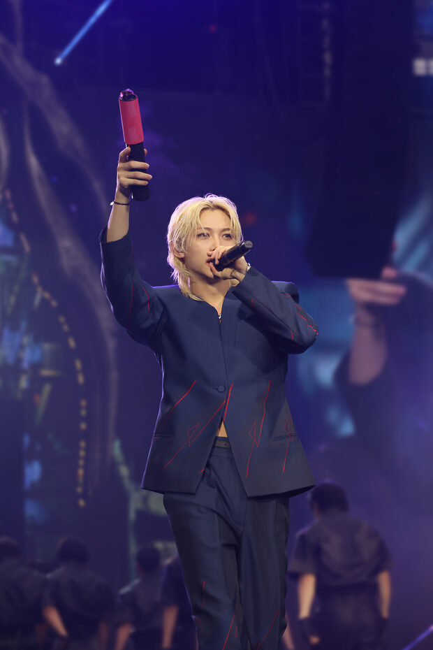 강렬한 무대 매너와 초저음 보이스로 무대를 장악하는 필릭스. 그는 루이 비통의 커스텀 룩을 착용했습니다. 카리스마 넘치는 필릭스의 룩엔 루이 비통 특유의 코드들이 곳곳에 숨어있었는데요. 모노그램 패턴과 하우스 특유의 실루엣이 그의 무대와 은은하게 어우러집니다.