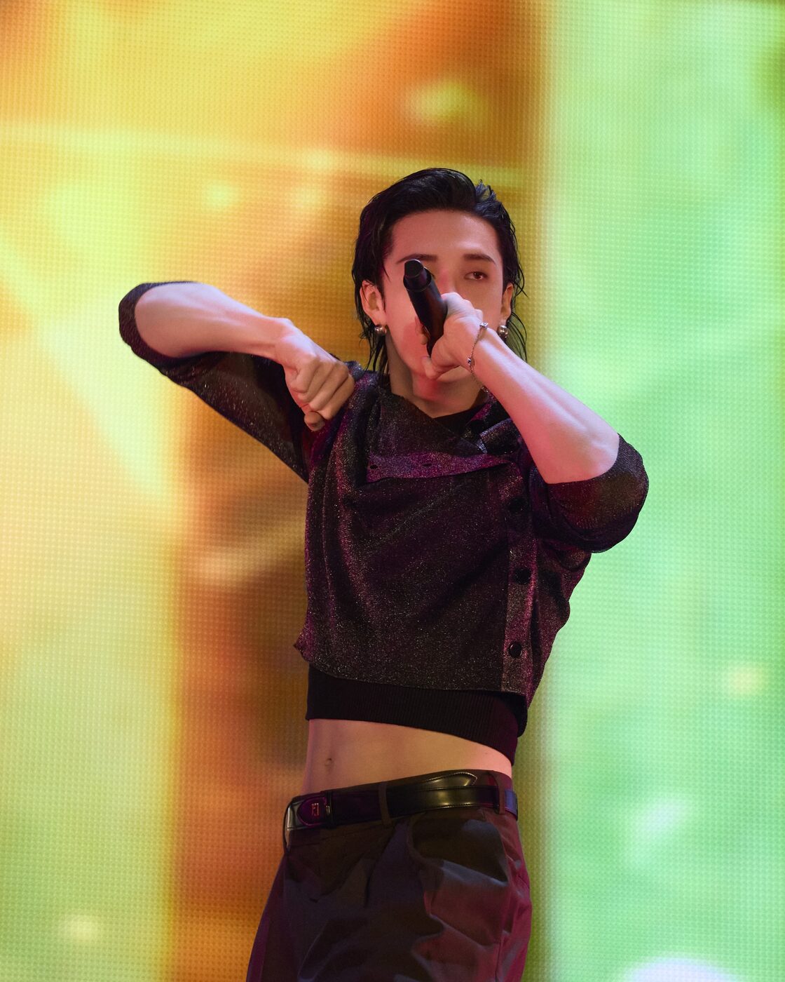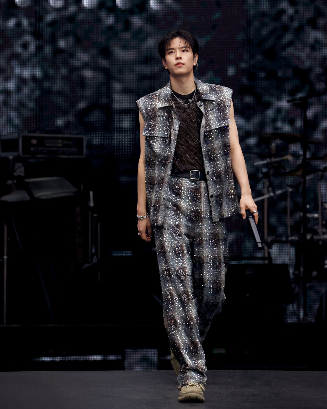 런던에서 버버리라니! 영국 핫스퍼 스타디움에서 진행 된 공연에서 승민은 버버리의 커스텀 룩을 입었습니다. 스와로브스키 크리스탈과 시퀸 소재는 하우스의 상징적인 체크 패턴과 만나 클래식하게 재해석된 모습! 체크 셋업에 매치한 과감한 메쉬 소재의 이너와 하이크 부츠는 승민의 트렌디한 이미지를 강조했죠.