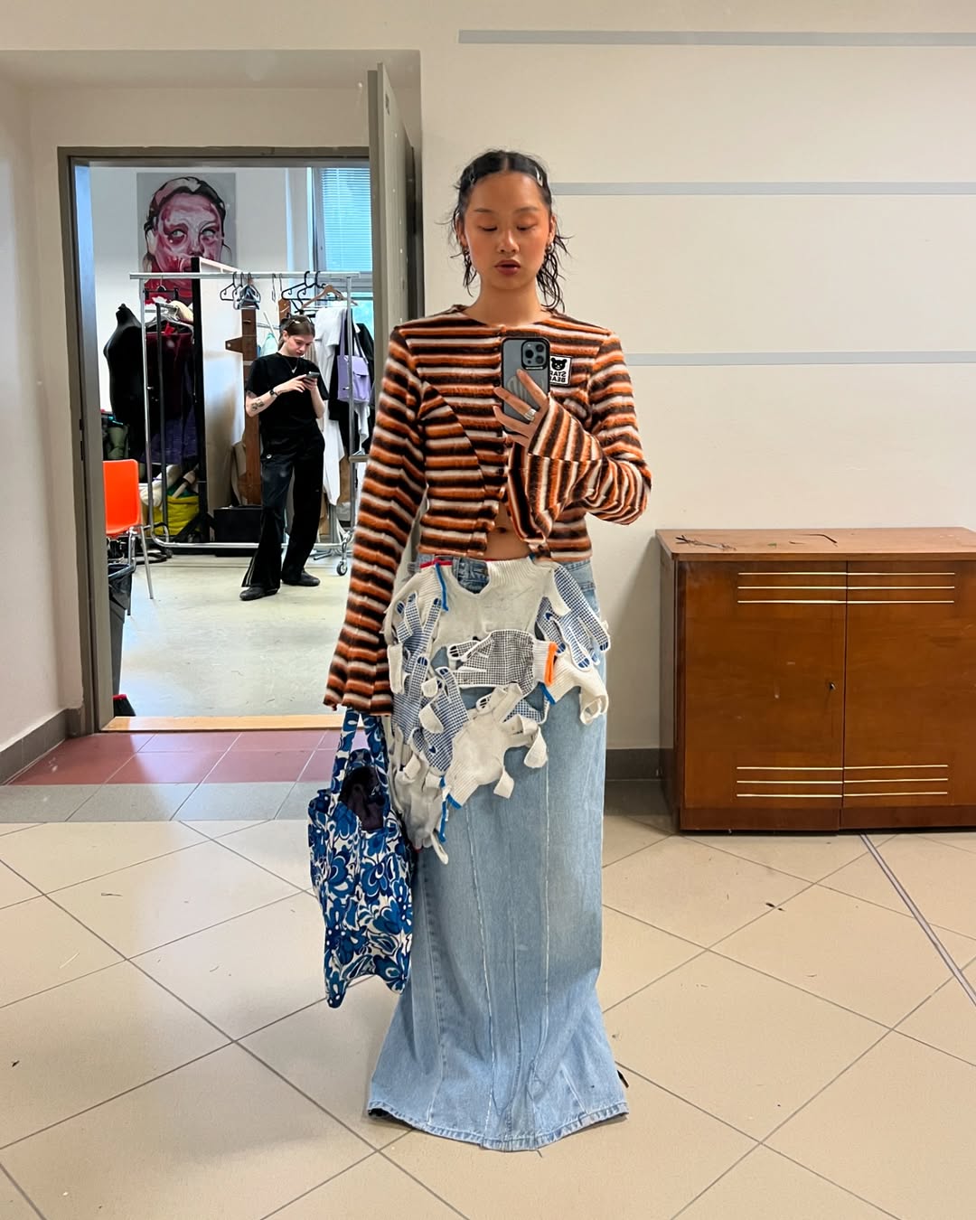 바닥을 끄는 듯한 데님 롱 스커트는 그 자체만으로도 강한 존재감을 드러냅니다. 여기에 아트워크처럼 디자인된 패브릭을 레이어드해 실험적인 무드를 더하고 경쾌한 스트라이프 톱으로 유니크한 매력을 극대화했죠. 프린트 토트백까지 더해 믹스매치의 감각이 돋보이는, 패셔니스타다운 스타일링을 완성했네요!