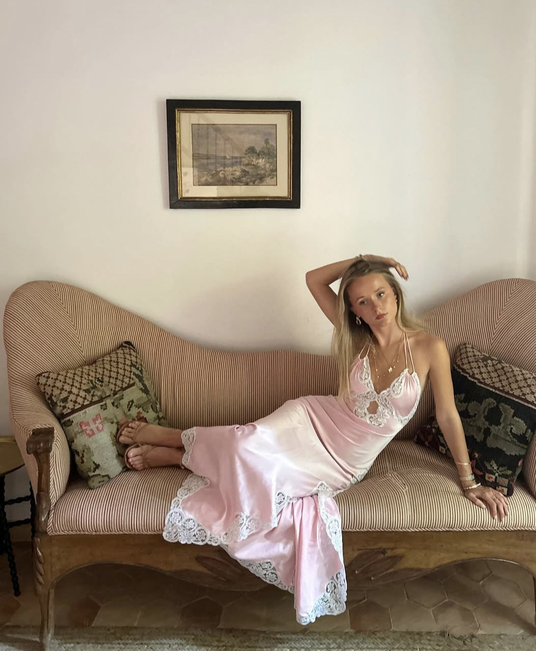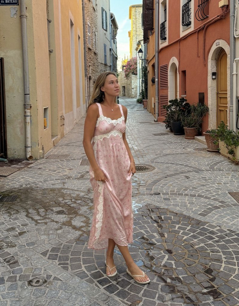 화이트 레이스 트리밍에 이어 잔잔한 패턴이 더해진 핑크 드레스. 과할 것 같던 장식 또한 한여름 분위기에 어우러져 로맨틱한 코티지 스타일링이 완성되었어요. 촌스러움 또한 사랑스러운 빈티지한 매력을 드러냈죠. 역시나 간편한 플립플롭과 가장 쿨한 조합을 이룹니다. (@chelseypecoy)