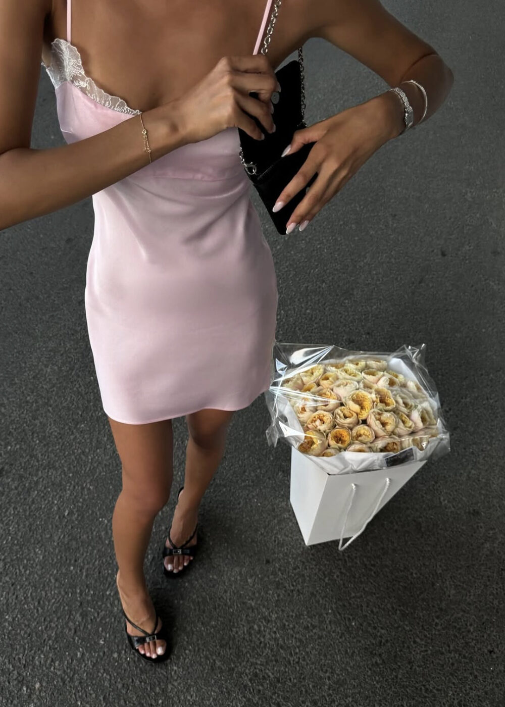 남친을 단숨에 반하게 할 강력한 데이트 룩을 찾고 있다면 연한 핑크 컬러의 가느다란 스트랩이 돋보이는 미디 드레스 어때요? 네크라인을 따라 앙증맞은 러플 장식이 시선을 사로잡은 미니멀한 라인의 드레스는 섹시함과 사랑스러움을 동시에 선사합니다. (@nude_story)