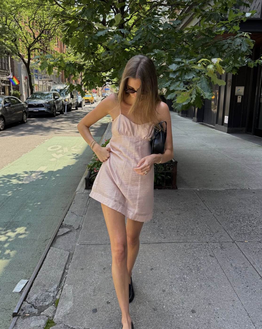 러플이나 레이스를 배제한 미니 핑크 드레스는 일상에서 입기에 더욱 적격합니다. 스파게티 스트랩에 가슴 부분의 주름 장식으로 볼륨감을 더한 슬립 형태의 미니 드레스는 무더위를 날려줄 치트키죠. 클래식한 블랙 발레리나 슈즈와 스몰 백을 매치해 시크함을 강조했어요. (@withshirey)