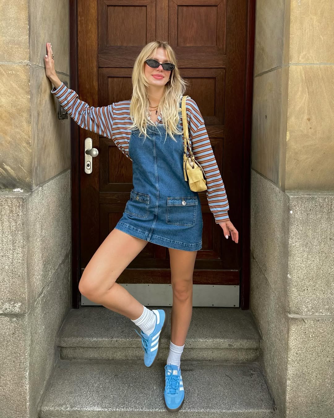 린다는 허리선이 낮고 루즈한 핏의 오버올 원피스로 걸리시하고도 캐주얼한 ootd를 완성했어요. 전체적으로 여유 있는 오버올 원피스는 하체 커버에도 효과적이고, 상체가 긴 체형에는 시각적으로 비율을 보완하는 장점이 있죠. 여기에 밝은 컬러의 티셔츠와 스니커즈를 매치하면 경쾌한 무드를 극대화할 수 있어요.