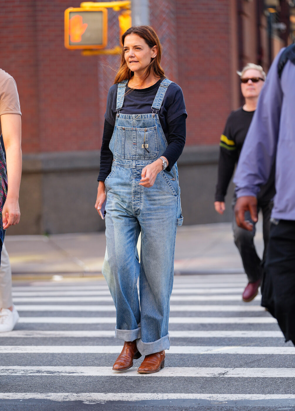 케이티 홈즈는 빈티지한 워싱이 매력적인 오버사이즈 오버올을 선택했습니다. 작업복에서 유래된 아이템답게 넉넉한 핏이 주는 여유로운 분위기의 스타일링이 잘 어울리죠. 여기에 케이티 홈즈는 무심하게 접어 올린 팬츠와 브라운 레더 부츠로 세련된 포인트를 더했어요.