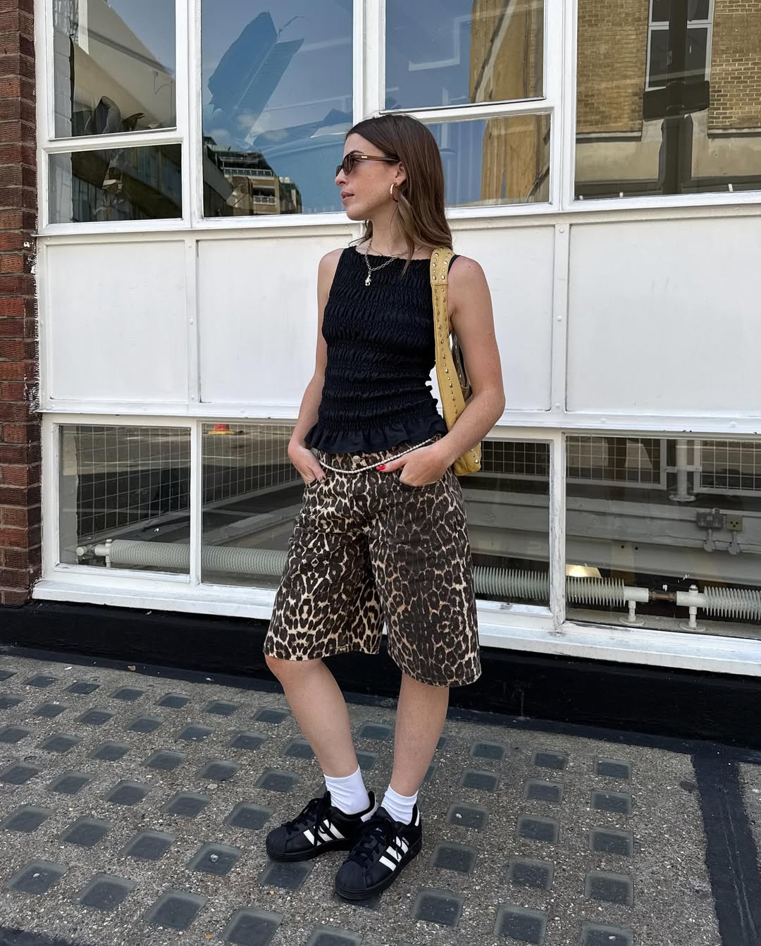 러블리한 스모크 슬리브리스를 레오퍼드 버뮤다팬츠와 함께 매치해 스트리트 스타일을 보여준 샬롯 올리비아. 스터드 디테일의 백과 벨리 체인으로 젠지 감성까지 잃지 않았죠. 이런 로맨틱한 아이템에는 레오퍼드 쇼츠처럼 터프한 아이템으로 밸런스를 맞춰주면 훨씬 더 담백한 스타일링이 완성됩니다.