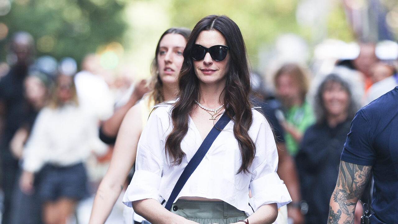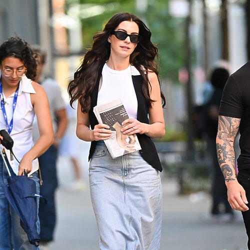 화이트 크롭 셔츠와 카키 컬러의 미디 플리츠 스커트로 깔끔하면서도 경쾌한 무드를 연출한 앤 해서웨이. 플리츠 스커트의 단정함에 큼직한 포켓 디테일이 더해져 유틸리티 감성을 살렸습니다. 여기에 톤온톤의 펌프스와 오버사이즈 블랙 선글라스로 도심 속 모던한 셀럽 룩을 완성!