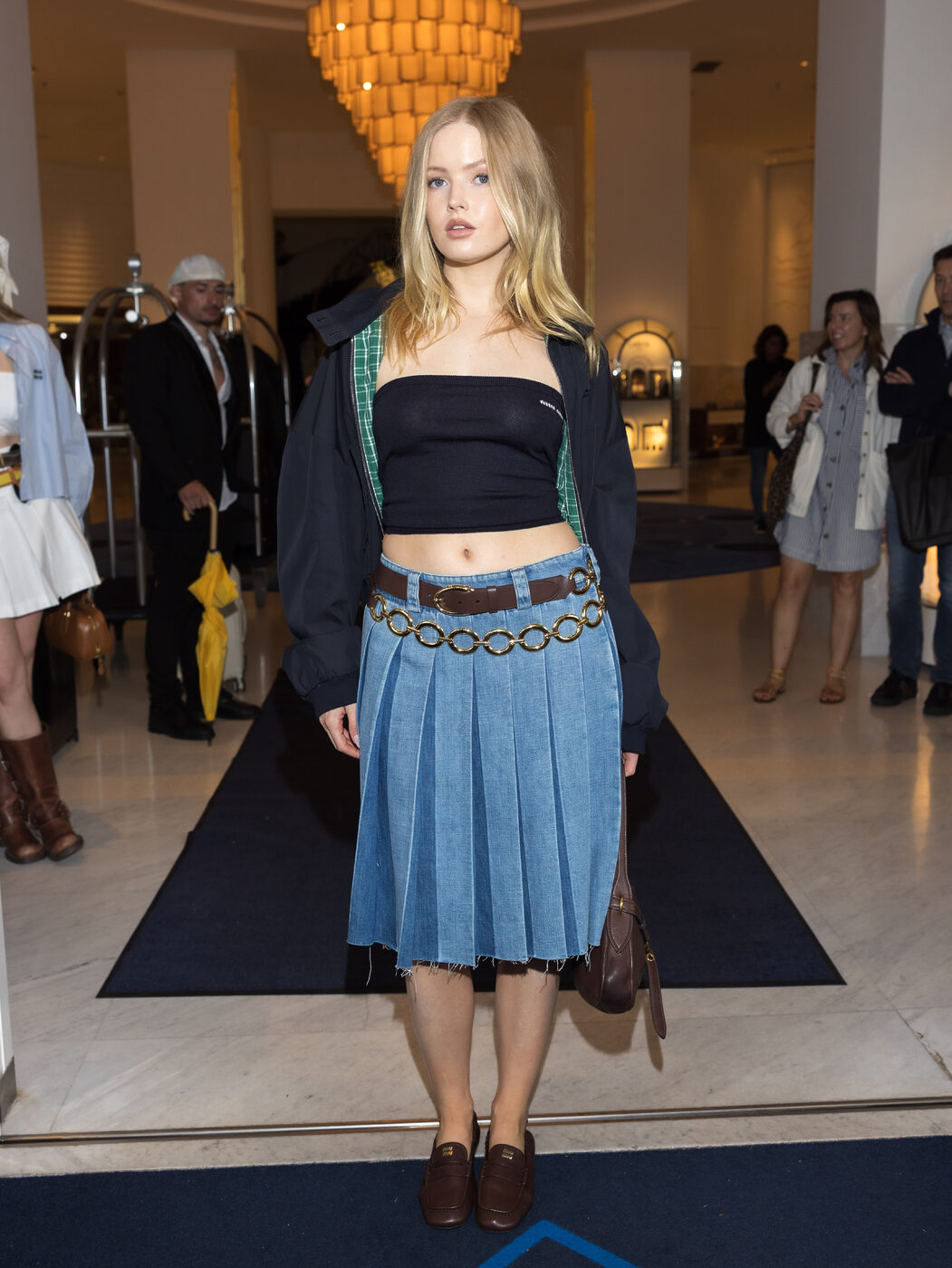 밑단이 풀어진 듯한 밝은 워싱의 데님 플리츠 스커트에 레더와 체인 벨트를 더해 완성한 Y2K 감성의 룩. 크롭 튜브 톱과 아우터를 매치해 경쾌하면서도 트렌디한 요소를 가미했죠. 브라운 컬러의 클래식 로퍼와 토트백으로 마무리해 레트로한 감성까지 제대로 살렸네요.
