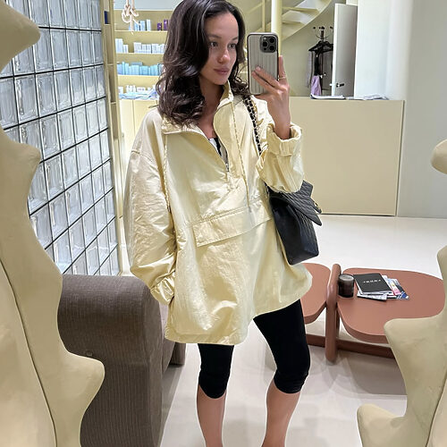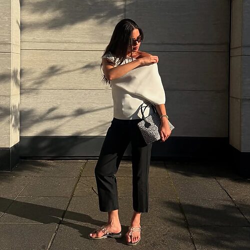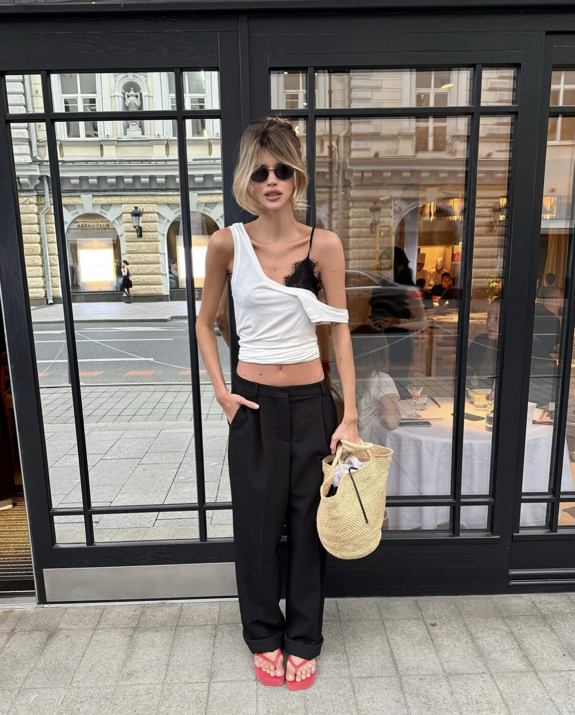 모노톤으로 절제된 룩 속, 단연 시선을 사로잡는 건 발끝의 레드 플립플랍이에요. 깔끔한 화이트 원숄더 톱과 블랙 슬랙스의 미니멀한 조합에 강렬한 컬러 한 방이랄까요? 라피아 토트백이 더해져 한층 여유로운 무드로 완성된 이 스타일은, 플립플랍이야말로 여전히 스트릿에서 유효하다는 걸 증명하네요.
