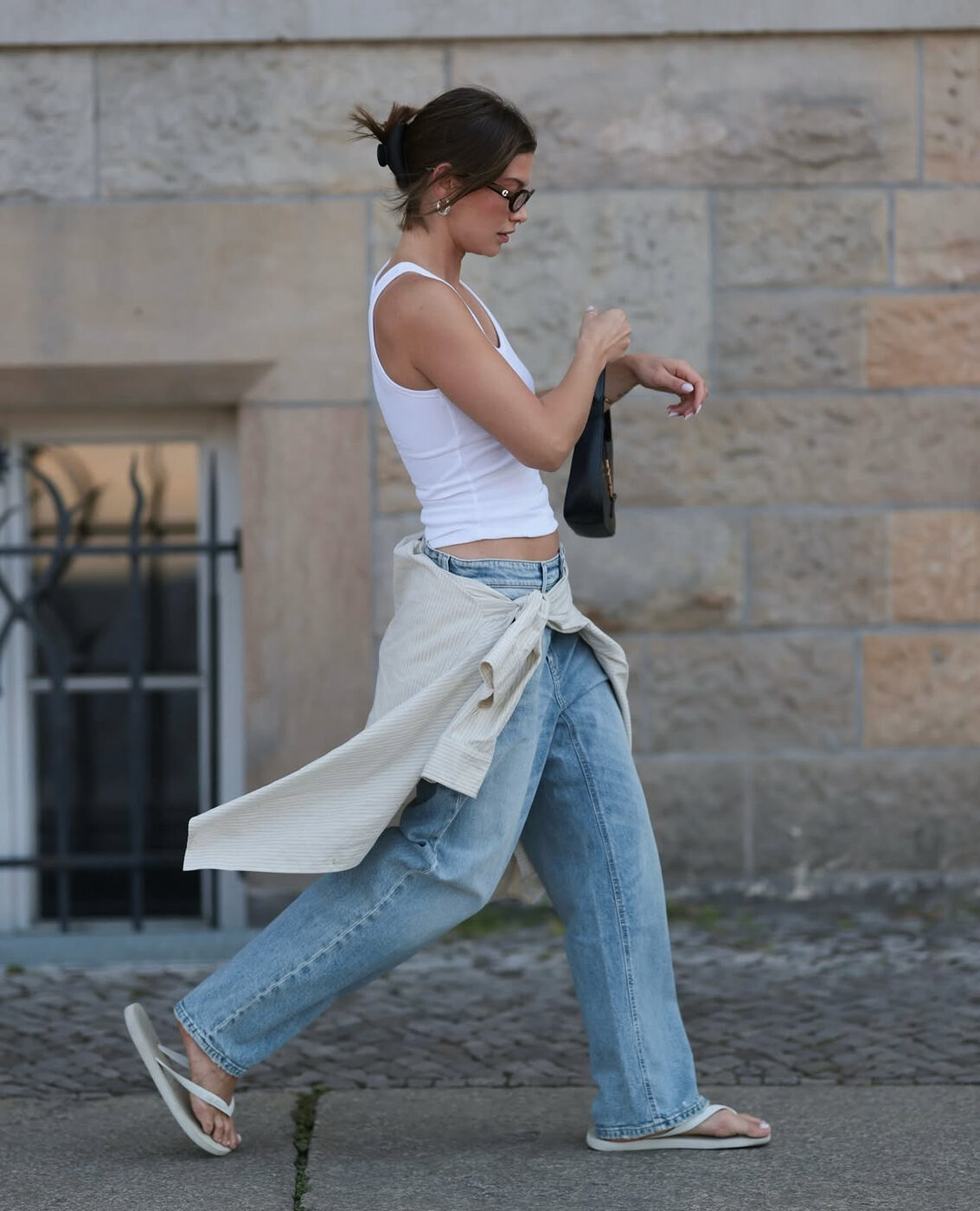 플립플랍의 매력은 이렇게 힘을 빼도 멋이 산다는 데 있습니다.화이트 슬리브리스와 데님 팬츠, 그리고 허리에 가볍게 묶은 셔츠까지. 무심히 걷는 것만으로 옷차림이 완성되는 여름의 정석이죠. 발끝까지 이어지는 화이트 톤이 룩에 청량감을 더하고, 편안함과 센스를 동시에 챙길 수 있는 데일리룩이네요.