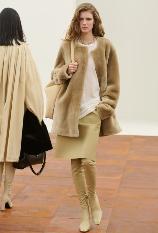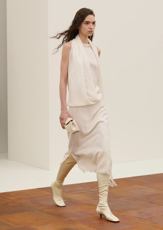 버클을 단 미우미우의 부츠를 주목 했어야 할 또 다른 이유, 바로 마치 타이츠를 신은 듯 다리에 착 달라붙은 착화감입니다. 토템에서도 마치 레더 스키니 팬츠를 입은 것처럼 가죽이 줄 수 있는 가장 타이트한 핏의 롱 부츠들을 선보였어요. 밝은 컬러가 더욱 시선을 사로잡는 이 부츠, 물론 다리가 가는 이들만 가능할 것 같은 슬픈 현실이 보이지만 미디 혹은 롱 스커트와 매치한 부츠의 모던하고 시크한 스키니 라인에 자꾸만 눈길이 갑니다.