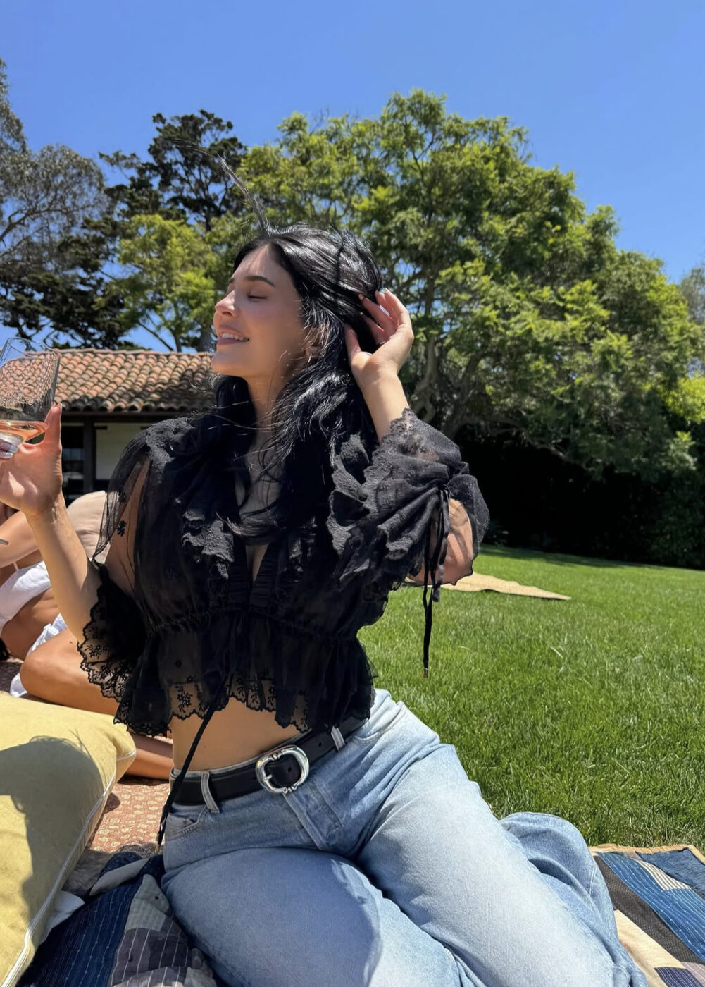 과장된 장식도, 터질듯한 섹시함도 내려두었습니다. 그렇다고 생일 파티가 열린 여유 가득한 정원에 어울릴 법한 플라워 패턴도 없었죠. 단지 보헤미언 감성 충만한 블랙 시스루 레이스 블라우스에 청바지를 입었을 뿐이에요. 그 무엇보다 카일리의 글래머러스함을 자연스럽게 표현해 주었어요.