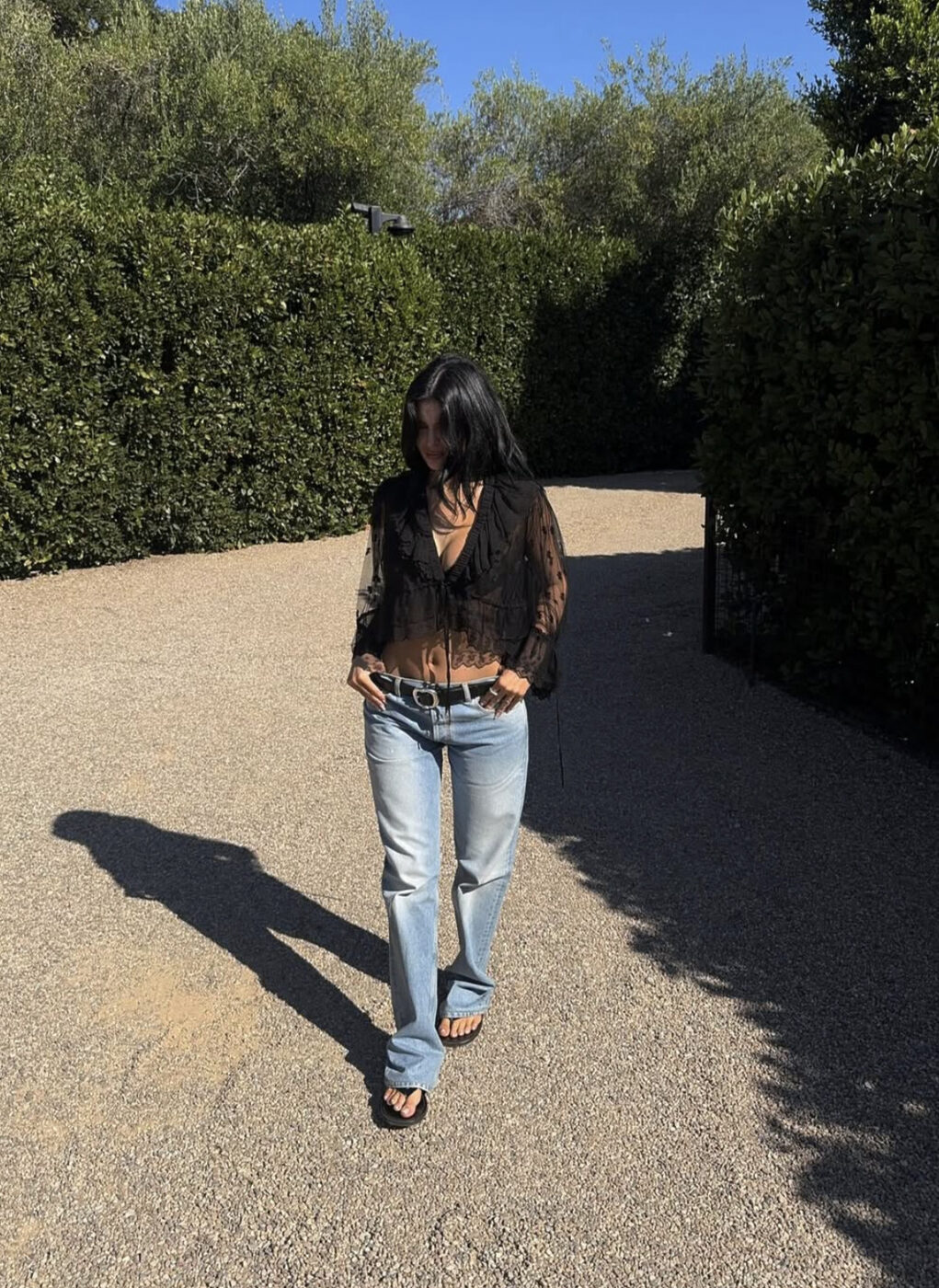 크롭 형식의 섬세하고 아름다운 시스루 블라우스엔 골반에 걸쳐 입는 로우 라이즈 일자 청바지를 입었습니다. 살짝 물이 빠진 연한 데님 컬러가 블랙과 더욱 선명한 대비를 이뤘죠. 룩의 화룡점정은 바로 크롬하츠 버클 벨트였어요. 블랙 레더에 실버 메탈 버클이 존재감을 드러내며 시크함을 더했어요. 청바지는 발등을 덮은 길이의 퍼들 스타일링으로, 그리고 심플한 블랙 플립플롭을 신어 여성스럽고 여유로움 가득한 스타일리시함을 뽐냈습니다.