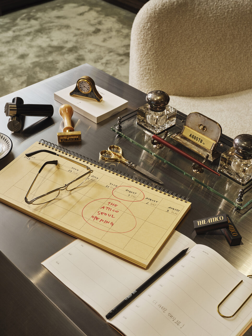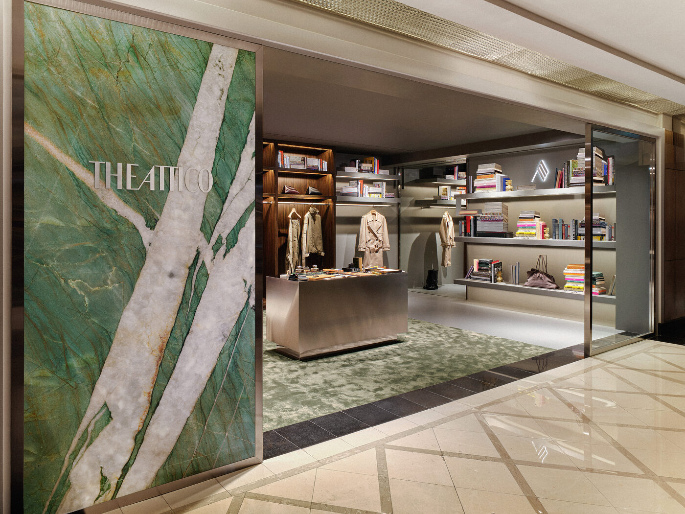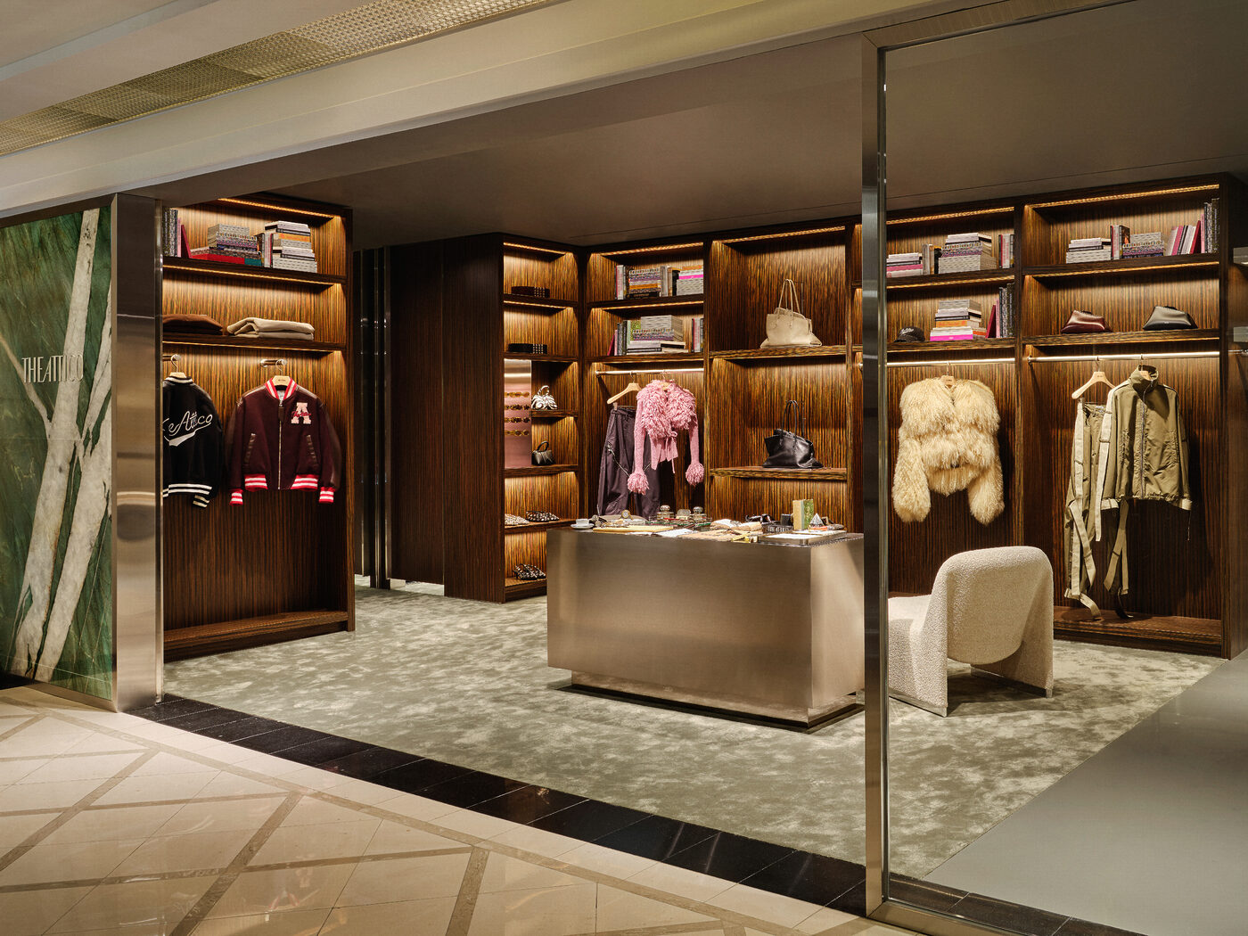 이탈리아어로 ‘펜트하우스’를 뜻하는 디아티코(THE ATTICO)는 질다 암브로시오(Gilda Ambrosio)와 조르지아 토르디니(Giorgia Tordini)가 2016년 설립한 밀라노 기반의 이탈리아 하이엔드 브랜드로 이름처럼 누구나 환영받는 웅장한 비전의 세계를 그려낸다. 특히 개성을 중시하고 두려움 없이 당당한 삶을 사는 여성을 표현하는 컬렉션이 특징이다. 이번에 오픈한 디아티코 갤러리아 EAST 매장은 ‘도서관(Library)’을 콘셉트로 따뜻한 우드 톤과 이탈리아 디자인 서적이 어우러져 감각적인 서재에 초대된 듯한 느낌을 전한다. 미드센추리 밀라노 스타일에서 영감을 받은 우드 패널과 책장은 고요하고 기품 있는 무드를 더하고, 회색 콘크리트 마감은 거칠지만 세련된 질감을 완성한다. 이와 더불어 대표 아이템인 브랜드 아이코닉 백 ‘라 파세지아타(La Passeggiata)’, ‘로빈(Robin)’ 부츠, 새롭게 선보이는 발레리나 플랫 ‘Floor 01’ 슈즈 등이 눈길을 사로잡는다.