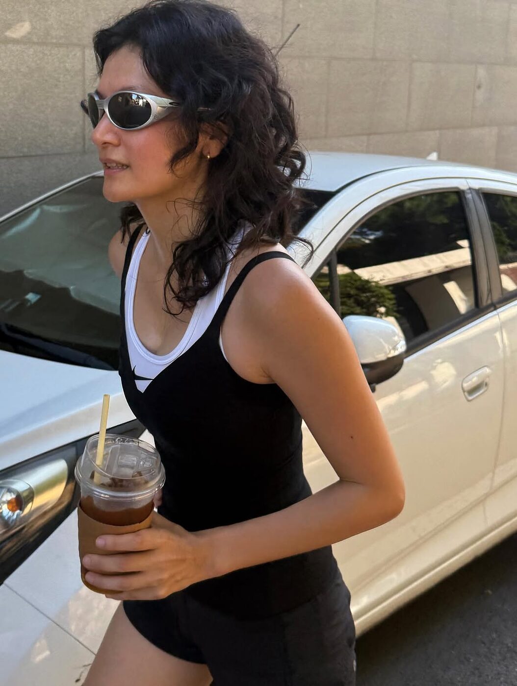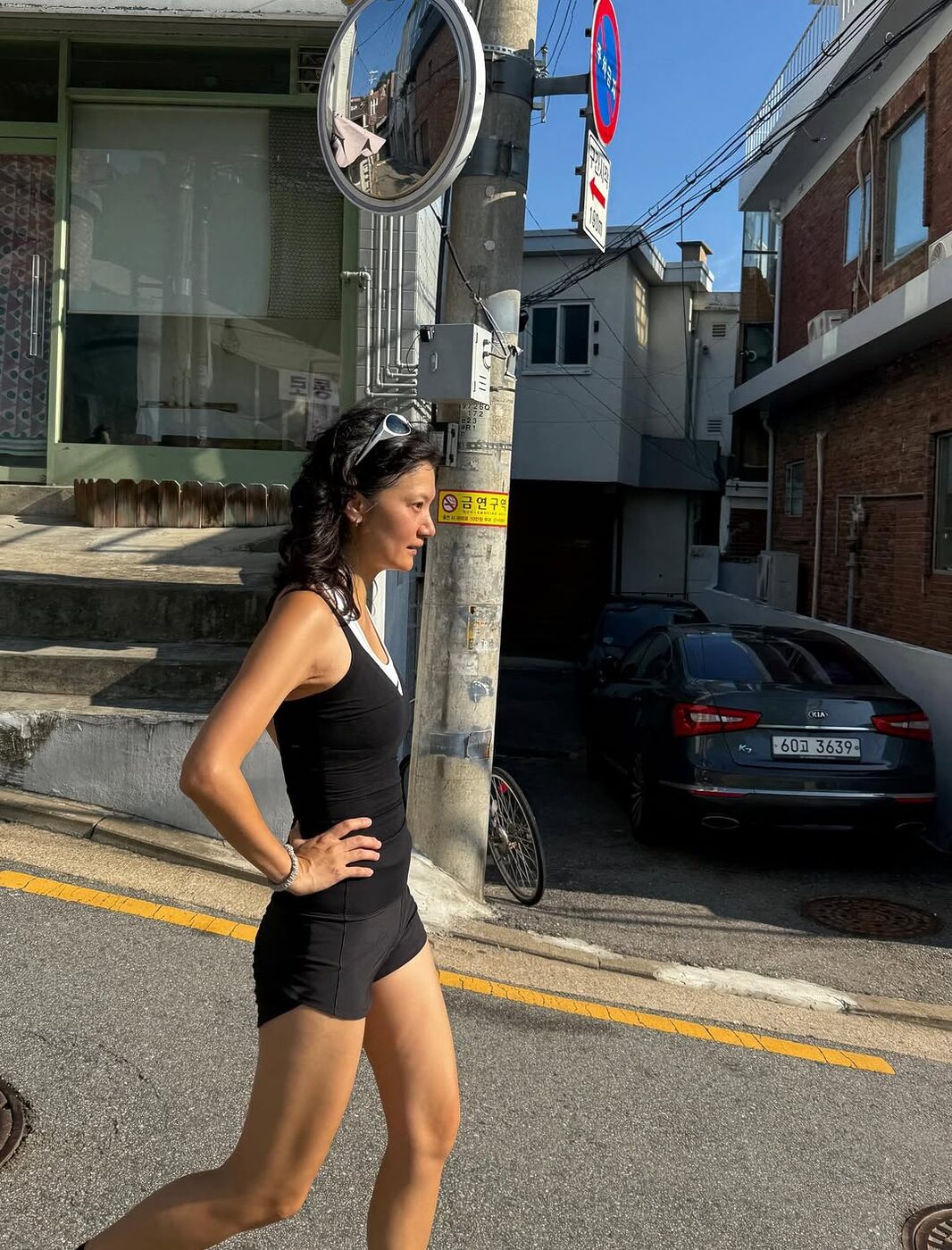 블랙과 화이트로 모던한 운동복 스타일링을 완성한 안아름 역시 스포티한 실버 선글라스를 잃지 않았습니다. 몸에 핏되는 운동복과 함께 얄상한 쉐입의 선글라스가 어우러지니 전체적으로 더욱 텐션감 넘치는 아웃핏이 완성되었죠.