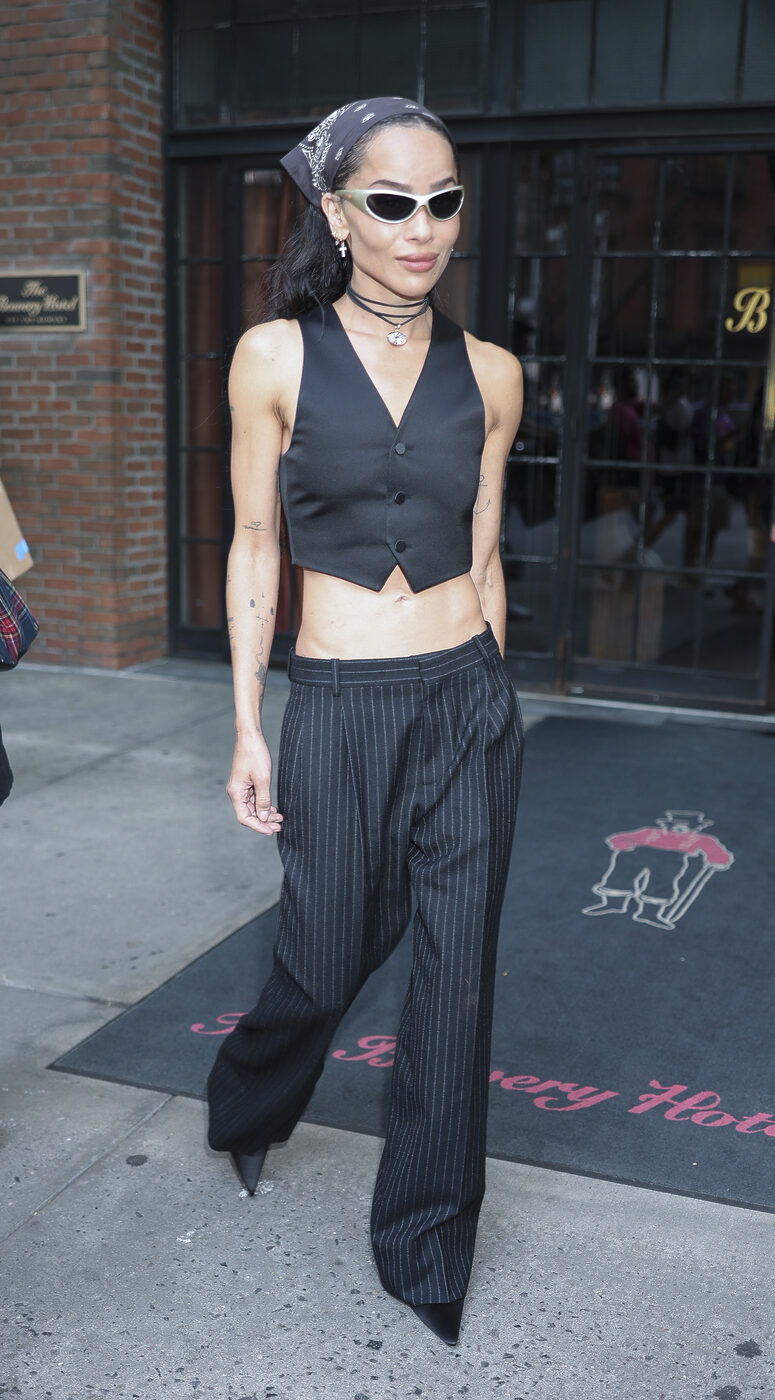‘레이트 나잇 위드 세스 마이어스(Late night with Seth Meyers)’ 쇼에 참석한 조 크라비츠의 모습. 언제나 쿨한 스타일링을 보여주는 그녀답게 이번에도 짧은 베스트와 핀 스트라이프 팬츠에 반다나와 실버 선글라스로 개성 넘치는 룩을 보여줬습니다. 포멀한 옷들도 의외의 액세서리가 더해지니 전혀 다른 분위기가 연출되는군요.