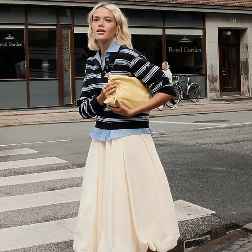 시퀸 스커트를 두 명이 나란히 입고 앉아 있으니, 보는 재미가 배가 됩니다. 오버사이즈 스트라이프 셔츠로 힘을 쭉 빼볼 수도, 레트로 감성의 레드 스트라이프 니트로 포근한 매력을 더해볼 수도 있겠죠.