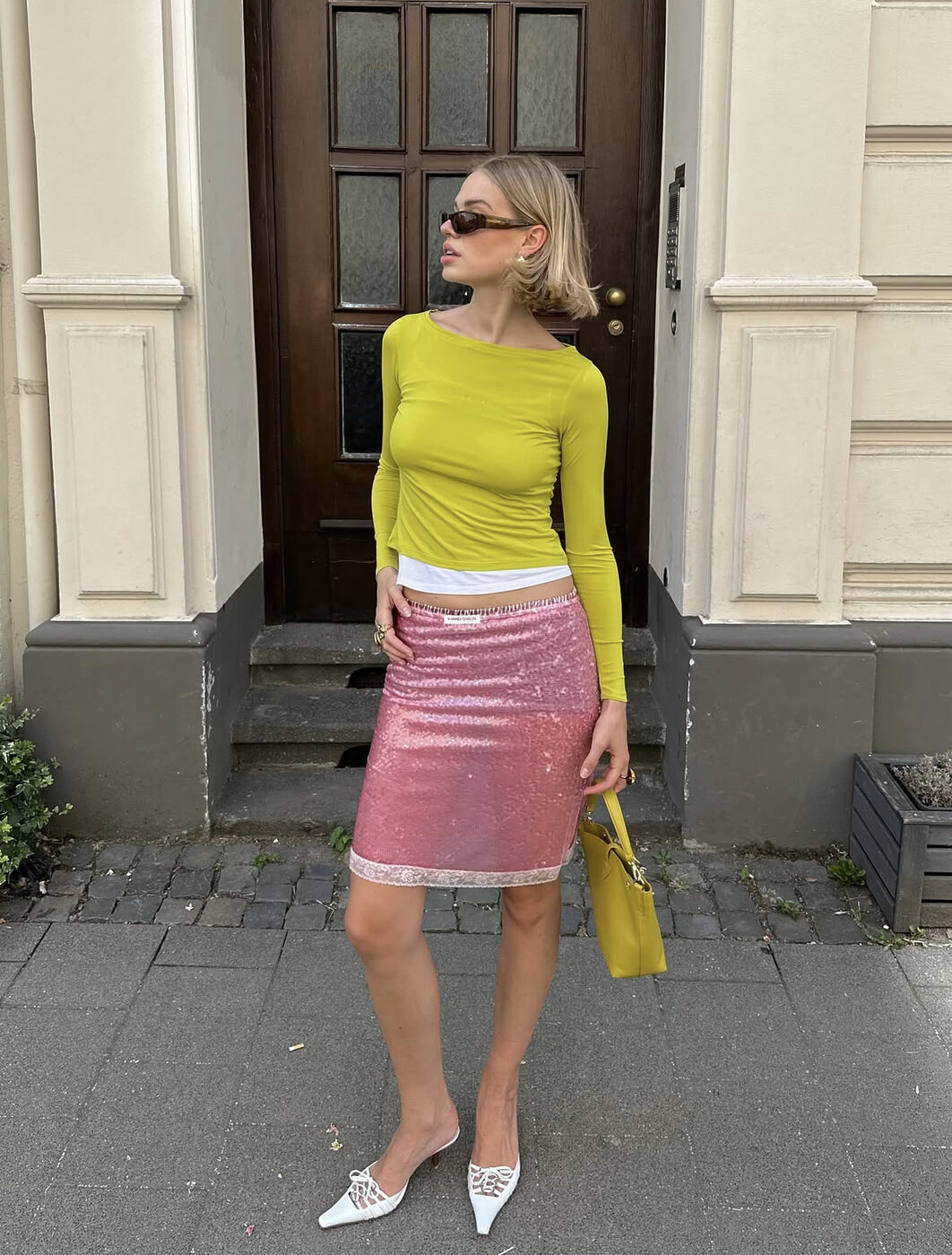 시퀸 스커트 하면 블랙이나 화이트를 떠올리기 쉽지만, 라임빛 슬림 톱으로 정면 승부를 걸어보는 것도 좋은 방법입니다. 꽤나 튀는 조합이지만, 오히려 쨍한 컬러와 반짝임이 만나 더 상큼해지거든요.