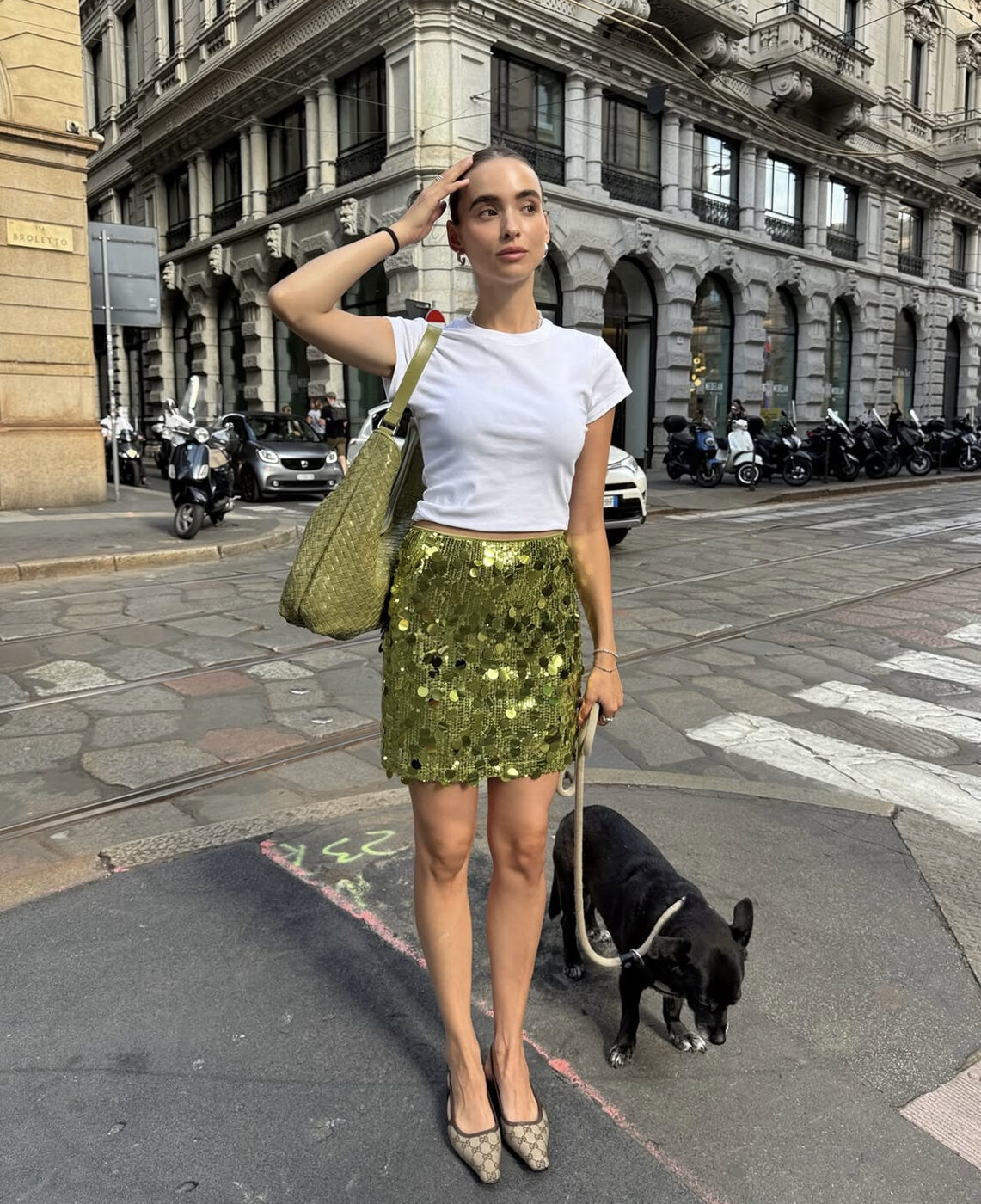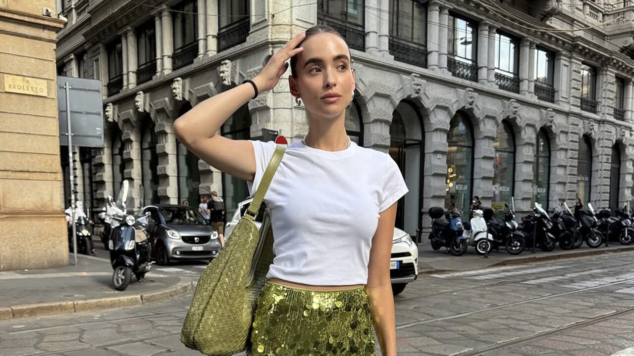 군더더기 없는 화이트 크롭 티셔츠에, 초록 시퀸 스커트가 주인공 자리를 꿰찼어요. 같은 컬러의 숄더백으로 매치감을 높이고, 로고 펌프스로 살짝 힘을 준 것이 포인트. 데일리로도 스팽글을 부담 없이 입는 법을 보여주는 모범적인 예시네요.