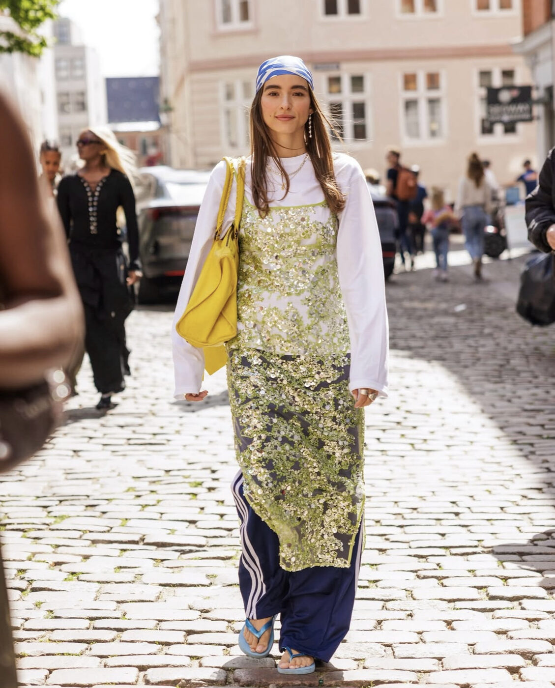 스팽글 드레스를 정석대로 입을 줄 알았다면 큰 오산! 과감하게 네이비 트랙 팬츠와 플립플랍을 매치했어요. 반짝이는 드레스의 화려함과 스포티웨어의 편안함, 이 의외의 조합이 바로 거리 패션의 묘미였습니다. 머리에 두른 블루 패턴 스카프와 옐로 백이 룩을 한층 센스 있게 마무리해줬고요.