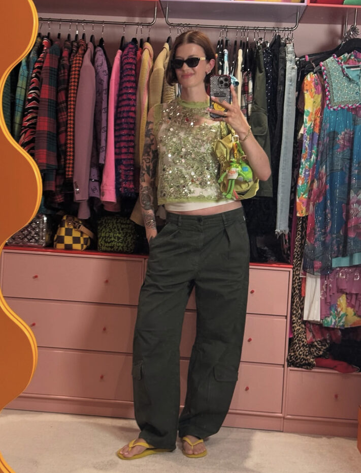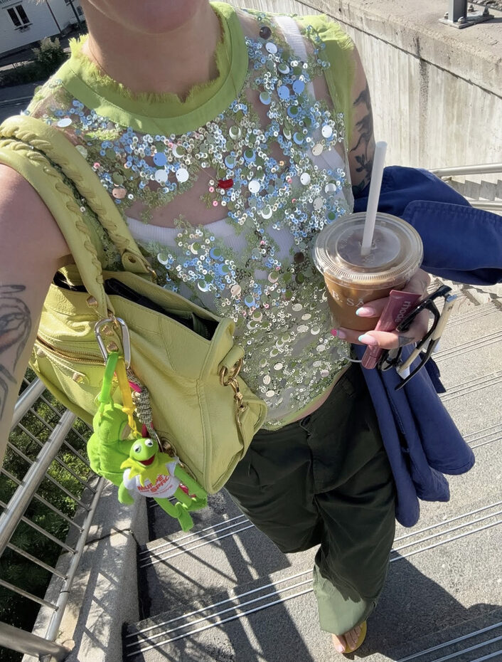 대부분 하의에서 강세를 보였던 시퀸. 톱으로도 역시 훌륭한 아이템이 됩니다. 연두빛 시퀸 크롭톱에 와이드한 카고 팬츠, 그리고 회심의 노란 쪼리. 백도 장난기 가득한 키링을 잔뜩 걸어 화려하면서 키치함을 놓치지 않는 센스까지! 이 정도면 가볍게 따라해볼 수 있겠죠.