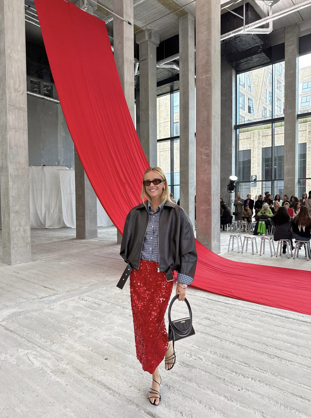 화려함의 끝판왕, 빨간 시퀸 스커트도 등장했습니다. 여기에 깅엄 체크 셔츠로 산뜻함은 추가하고, 루즈한 레더 재킷으로 무게감을 더했네요. 발끝은 블랙 스트랩 샌들로 마무리해, 과감함과 캐주얼한 무드를 동시에 잡아보는 건 어떨까요?