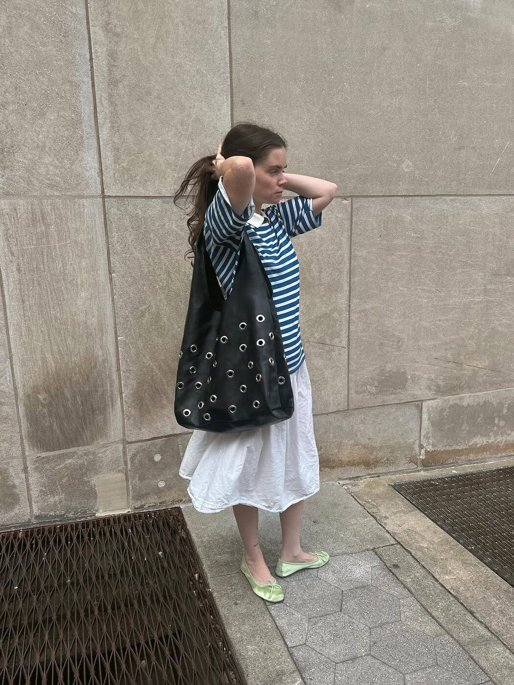 알싸한 빨간색과 레몬색의 컬러 대비를 준 인플루언서 리즈 블럿스타인. 화사한 두 컬러가 만나 시너지를 내는 룩이 완성되었습니다. 이때 채도가 높은 레드를 고르는 것이 포인트죠.