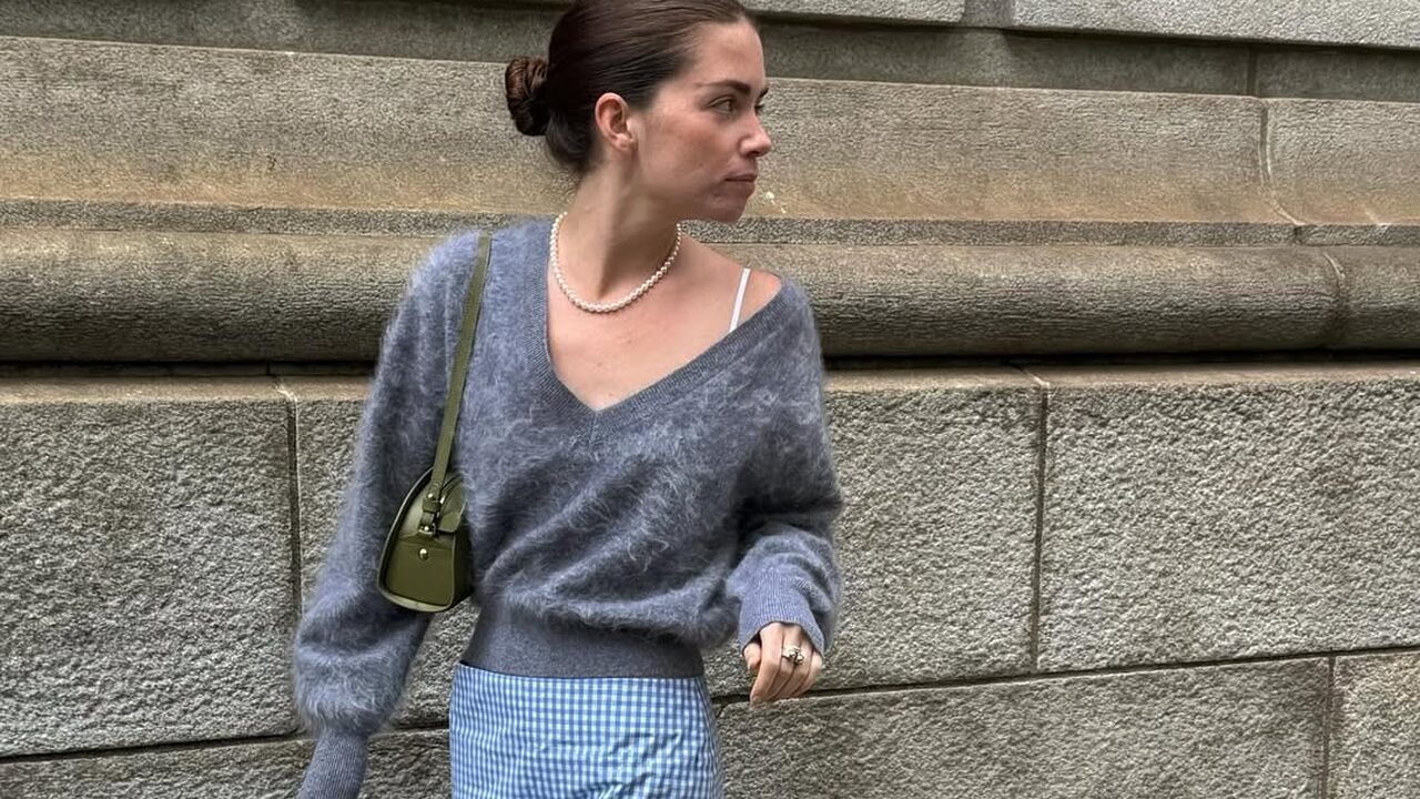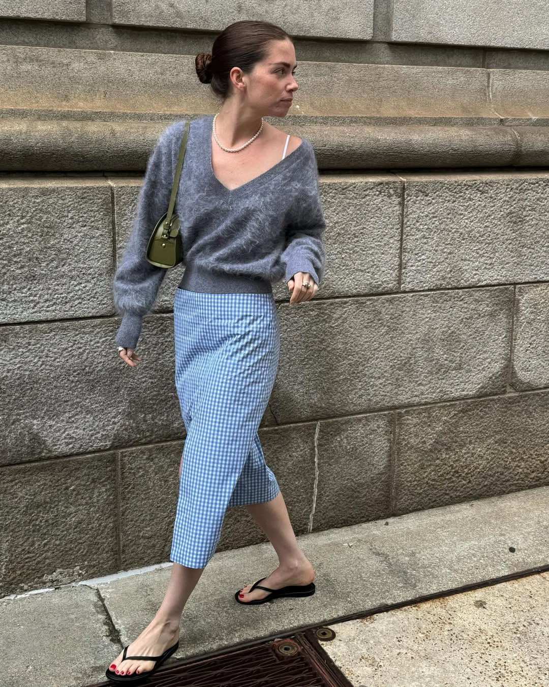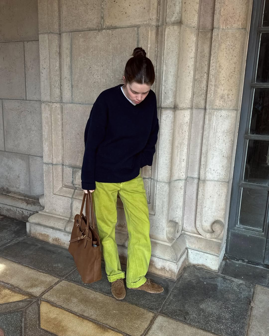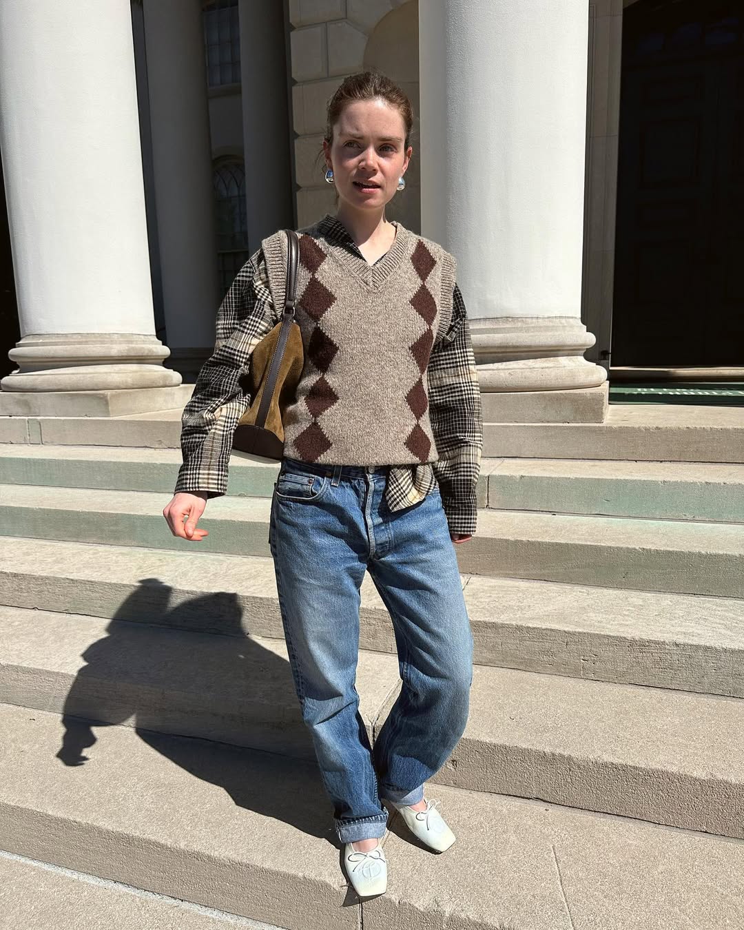 90년대 레트로 무드를 참고하는 것도 좋은 방법입니다. 당시 브이넥 니트는 프레피 룩의 상징이었죠. 체크 셔츠와 빈티지 데님, 로퍼 조합은 여전히 멋스럽죠. 동시대적인 느낌의 발레 플랫과도 잘 어울리고요.