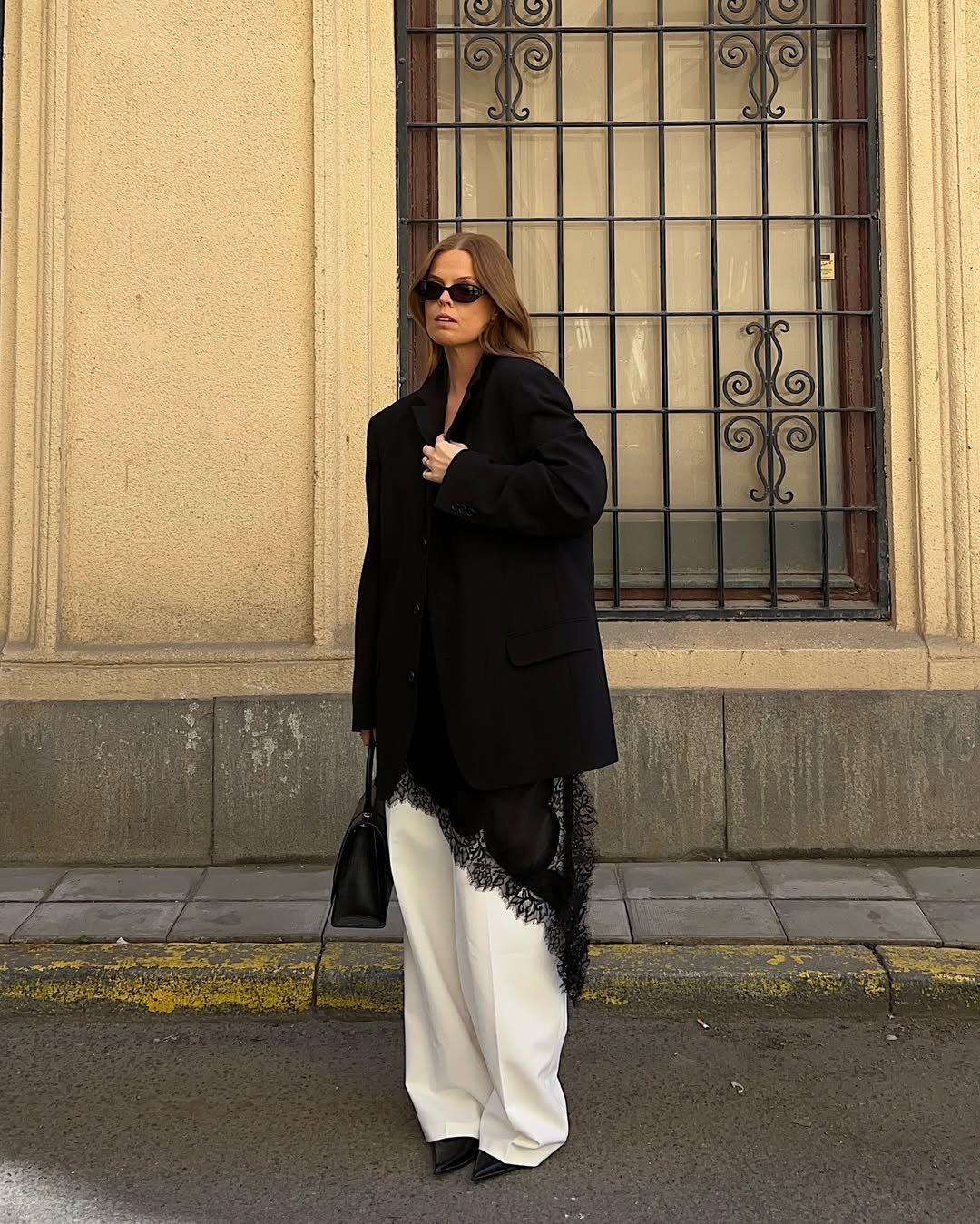 니트 외에 재킷에도 활용하기 좋은데요. 재킷 슈트의 딱딱한 느낌을 레이스가 중화시켜주는 역할을 합니다. 사진처럼 재킷과 팬츠를 모두 오버사이즈로 하고, 슬립 스커트 역시 무릎까지 내려오는 길이로 전체적으로 여유있는 실루엣을 고른다면 좀 더 아티스틱하고 모던한 분위기를 낼 수 있죠.