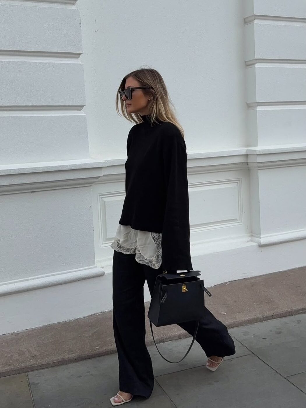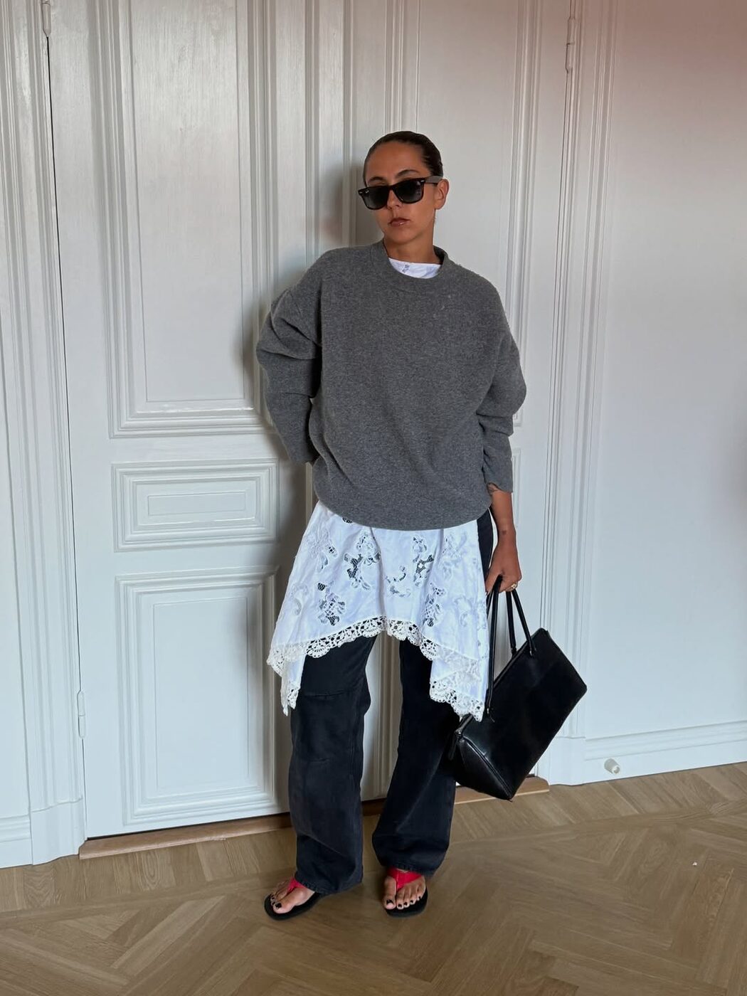 그간 니트에 얇은 슬립 드레스를 레이어드 하는 방식은 익숙한 스타일링 중 하나죠. 하지만 올 가을 유행할 레이어링은 여기에 바지까지 더하는 것입니다. 벌키한 니트와 여유있는 팬츠 사이에 마치 레이스 장식이 더해진 것처럼 짧은 슬립 드레스나 튜닉을 더해주세요. 무채색 룩의 심심함을 달래주기에 좋죠.