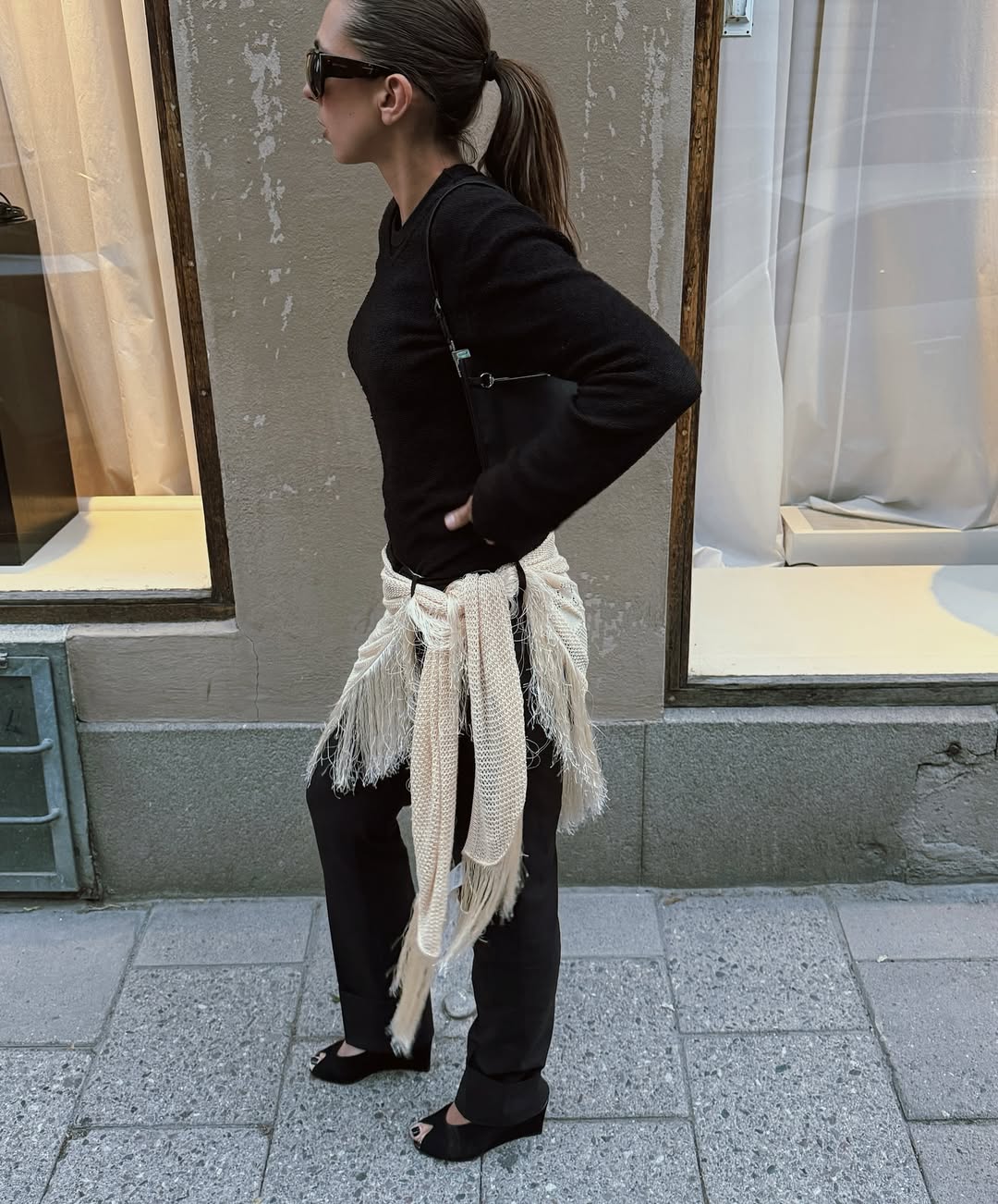 레이스 슬립 대신 아주 얇거나 태슬이 더해진 스카프로 대체해도 좋습니다. 움직일 때 마다 리듬감이 더해지는 룩이 완성되죠. 봄, 여름에만 꺼내던 스카프를 가을까지 활용하기도 좋고요.