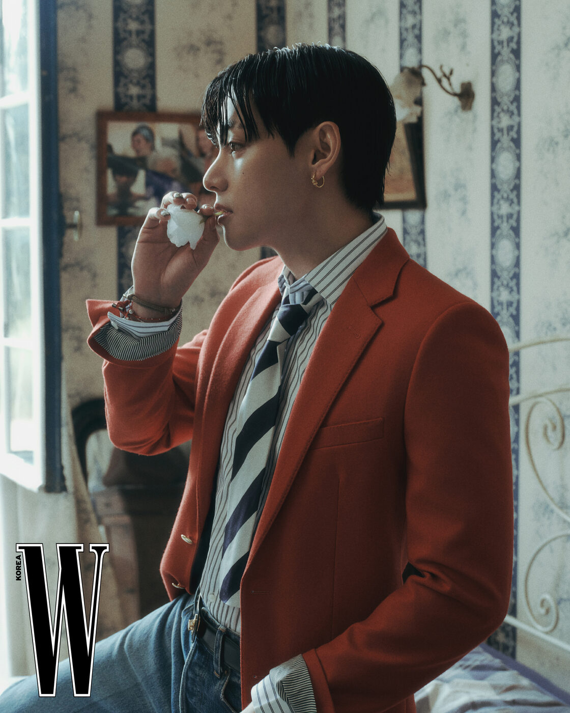 빨강 그라함 재킷과 데님 팬츠, 안에 입은 줄무늬 셔츠와 타이, 벨트, 액세서리는 Celine 2026 Spring Collection 제품.