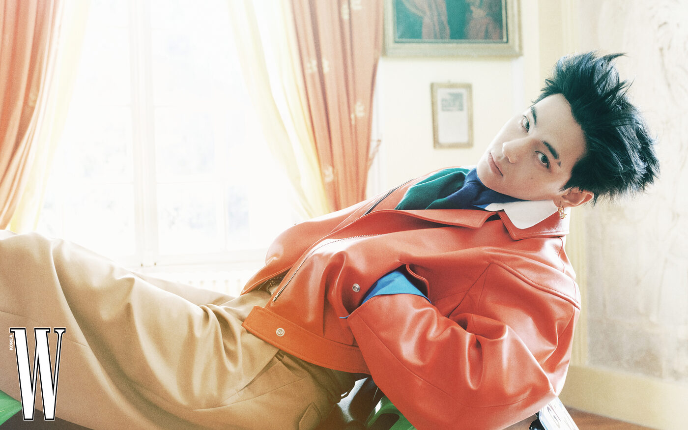 펜던트 장식 바이커 재킷과 파랑 머플러, 팬츠와 슈즈는 Celine 2026 Spring Collection 제품.